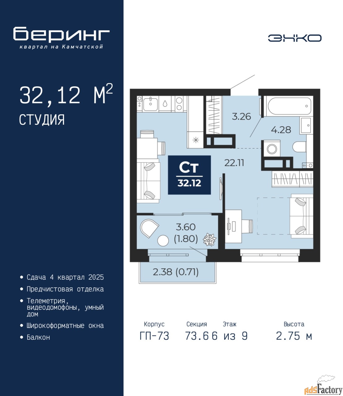 | Высота потолков (м.) | 2.75 |