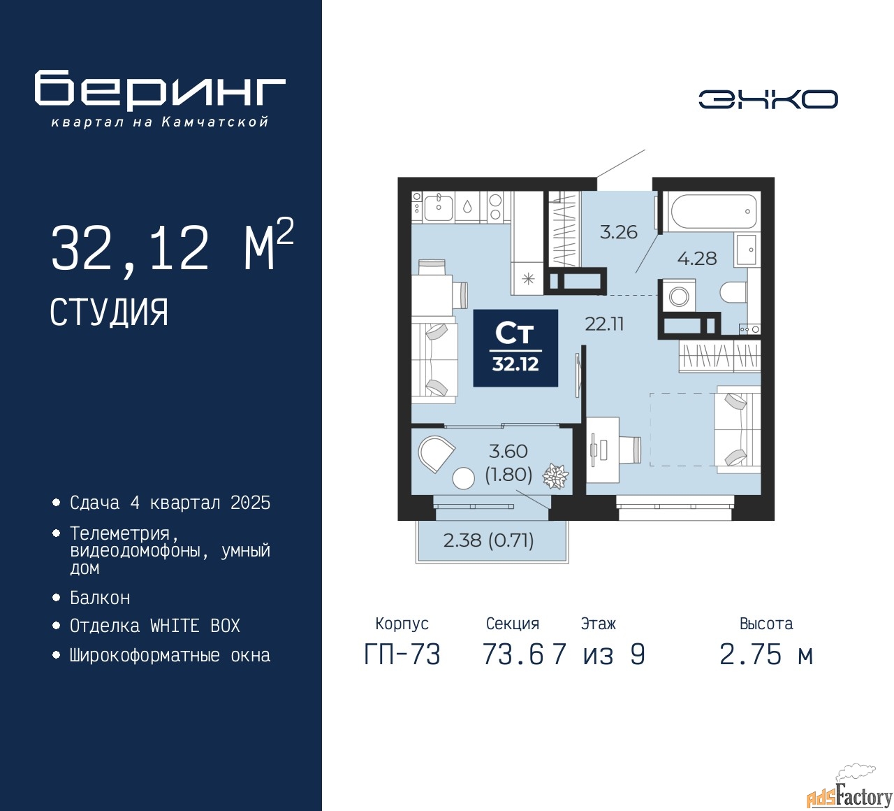 | Высота потолков (м.) | 2.75 |