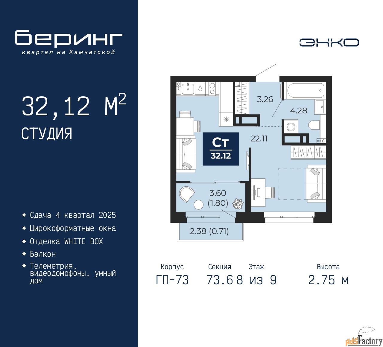 Дом монолитный, многоподъездный, переменной этажности, от 9 до 22 этажей. Квартира находится в 73.6-й секции высотой 9 этажей в корпусе ГП-73. На этаже 5 квартир. В подъезде 1 пассажирский и 1 грузовой лифт. Окончание строительства - 4 квартал 2025 года. Оформление сделки по договору долевого участия.