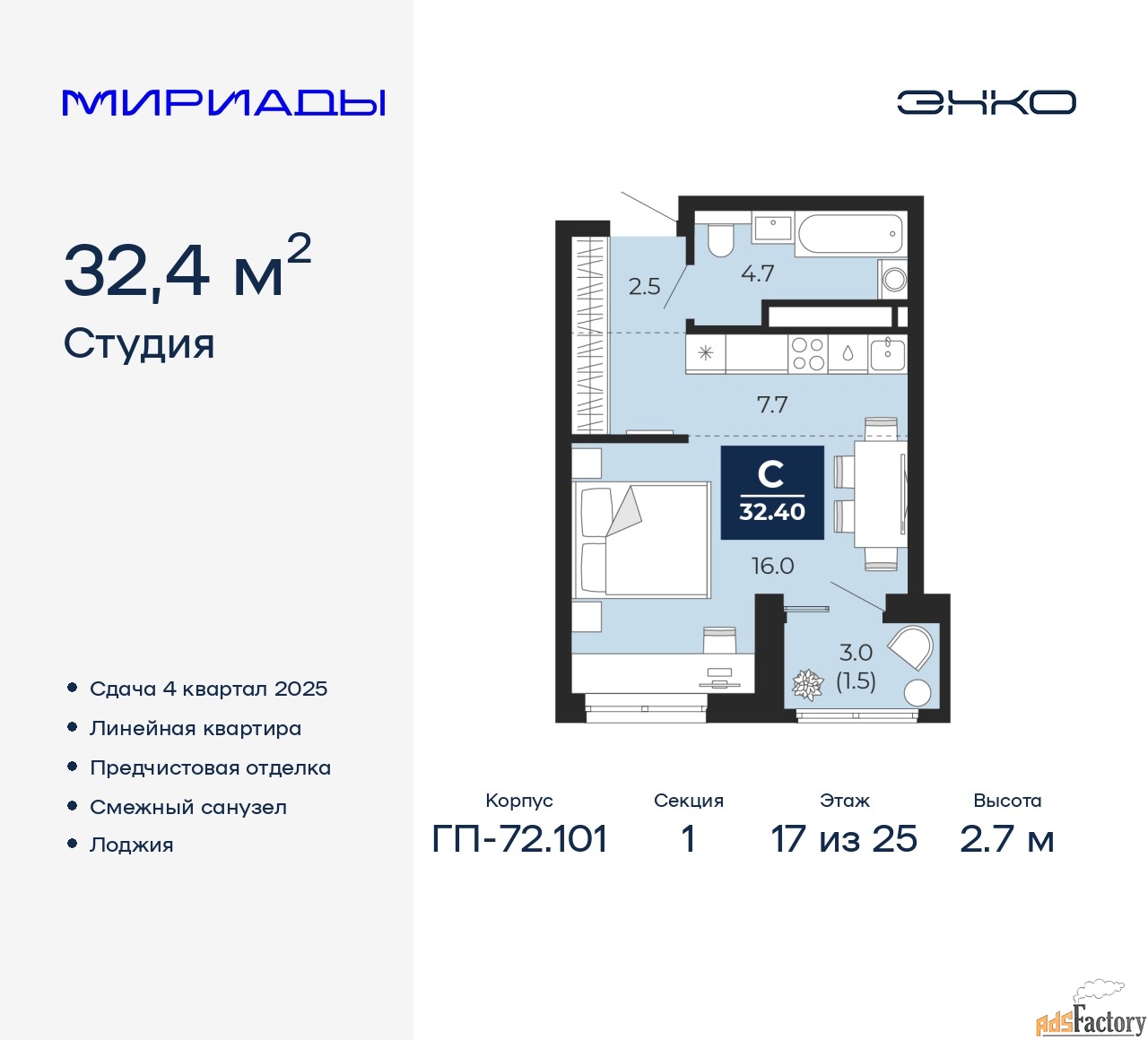Квартира находится в корпусе ГП-72.101. Дом монолитный, одноподъездный, высотой 25 этажей. На этаже 8 квартир. В подъезде 2 пассажирских и 1 грузовой лифт. Окончание строительства - 4 квартал 2025 года. Оформление сделки по договору долевого участия.