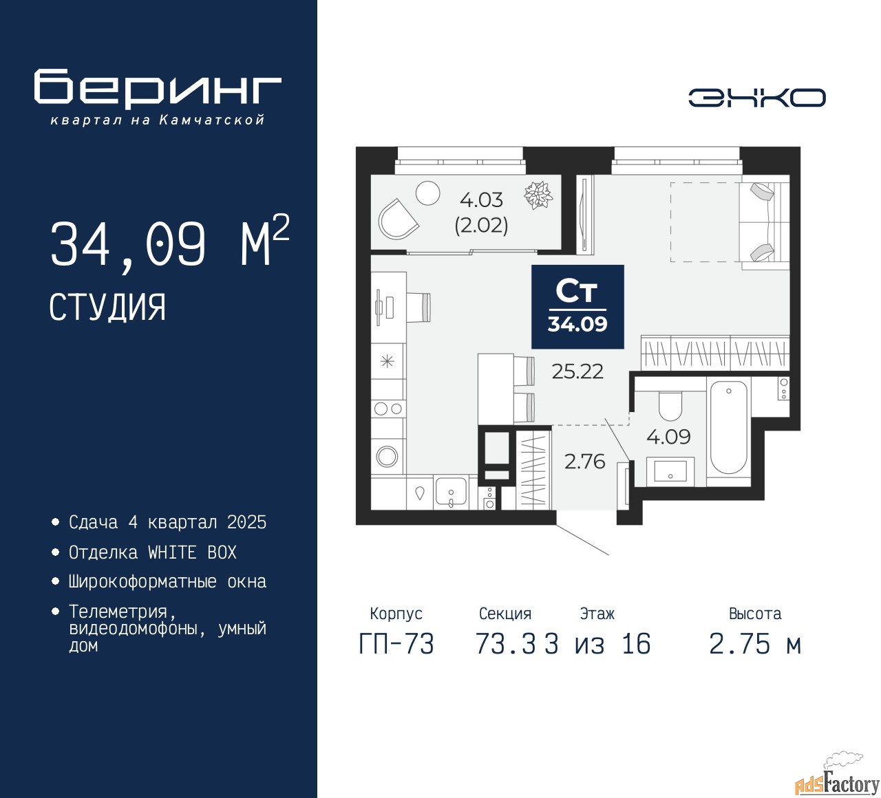 Дом монолитный, многоподъездный, переменной этажности, от 9 до 22 этажей. Квартира находится в 73.3-й секции высотой 16 этажей в корпусе ГП-73. На этаже 8 квартир. В подъезде 1 пассажирский и 1 грузовой лифт. Окончание строительства - 4 квартал 2025 года. Оформление сделки по договору долевого участия.