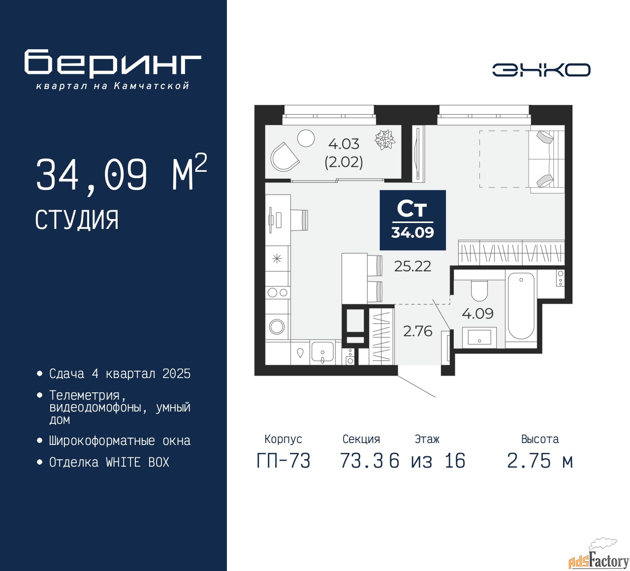 Дом монолитный, многоподъездный, переменной этажности, от 9 до 22 этажей. Квартира находится в 73.3-й секции высотой 16 этажей в корпусе ГП-73. На этаже 8 квартир. В подъезде 1 пассажирский и 1 грузовой лифт. Окончание строительства - 4 квартал 2025 года. Оформление сделки по договору долевого участия.