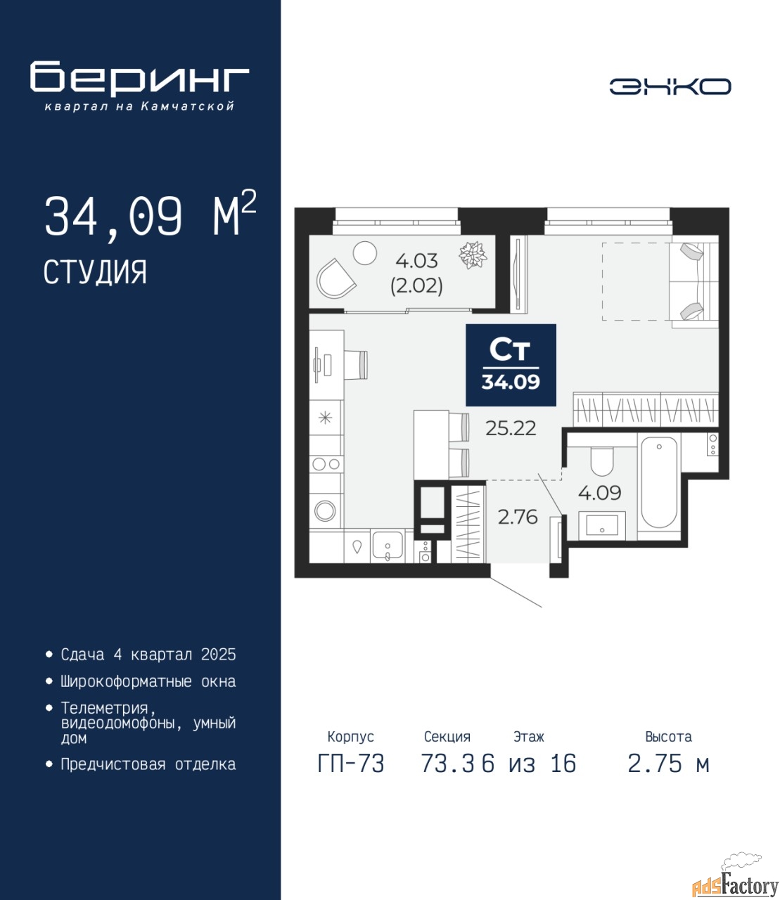 Дом монолитный, многоподъездный, переменной этажности, от 9 до 22 этажей. Квартира находится в 73.3-й секции высотой 16 этажей в корпусе ГП-73. На этаже 8 квартир. В подъезде 1 пассажирский и 1 грузовой лифт. Окончание строительства - 1 квартал 2026 года. Оформление сделки по договору долевого участия.