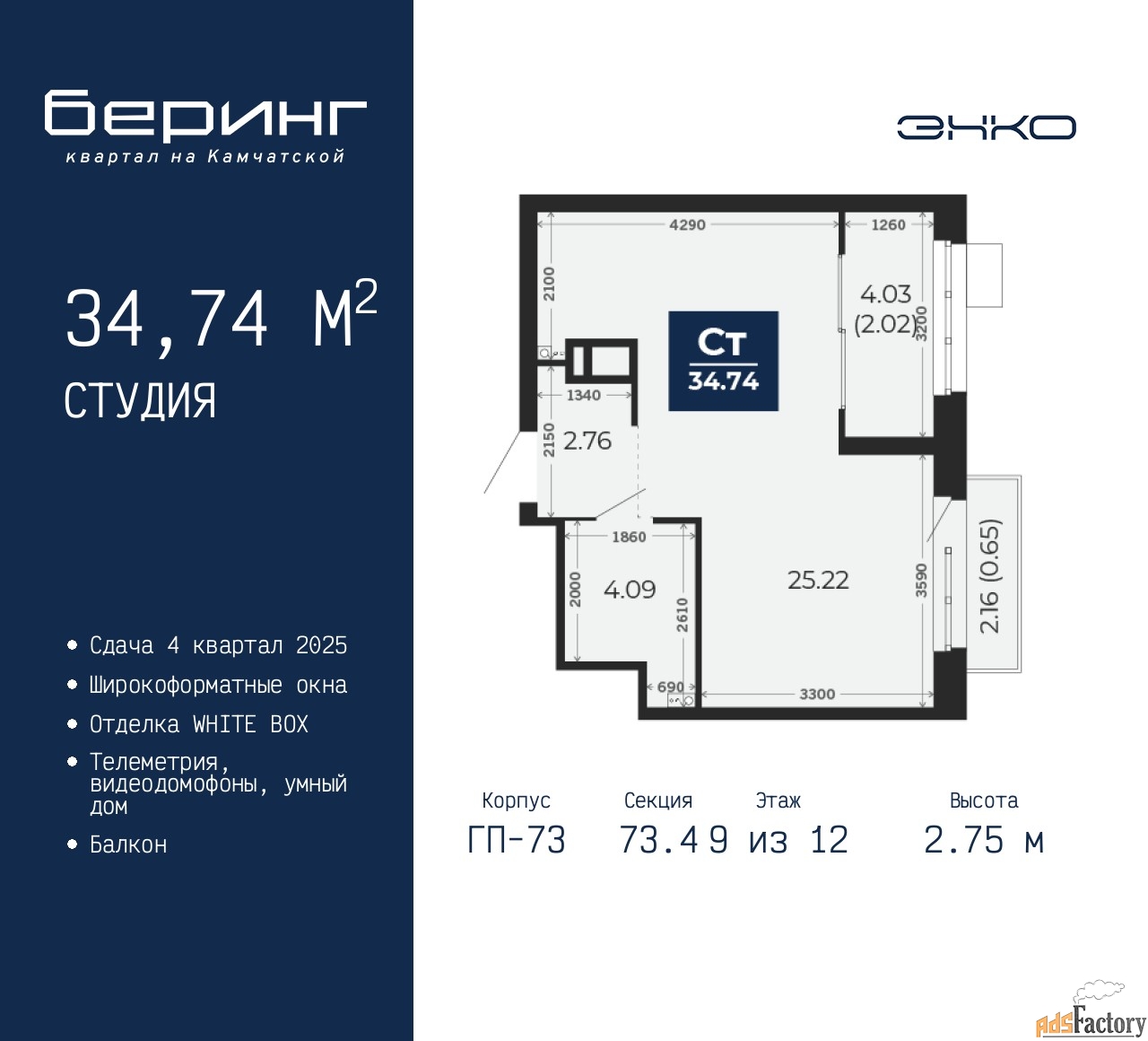 Дом монолитный, многоподъездный, переменной этажности, от 9 до 22 этажей. Квартира находится в 73.4-й секции высотой 12 этажей в корпусе ГП-73. На этаже 8 квартир. В подъезде 1 пассажирский и 1 грузовой лифт. Окончание строительства - 4 квартал 2025 года. Оформление сделки по договору долевого участия.
