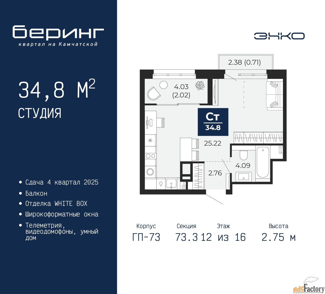 Дом монолитный, многоподъездный, переменной этажности, от 9 до 22 этажей. Квартира находится в 73.3-й секции высотой 16 этажей в корпусе ГП-73. На этаже 8 квартир. В подъезде 1 пассажирский и 1 грузовой лифт. Окончание строительства - 4 квартал 2025 года. Оформление сделки по договору долевого участия.