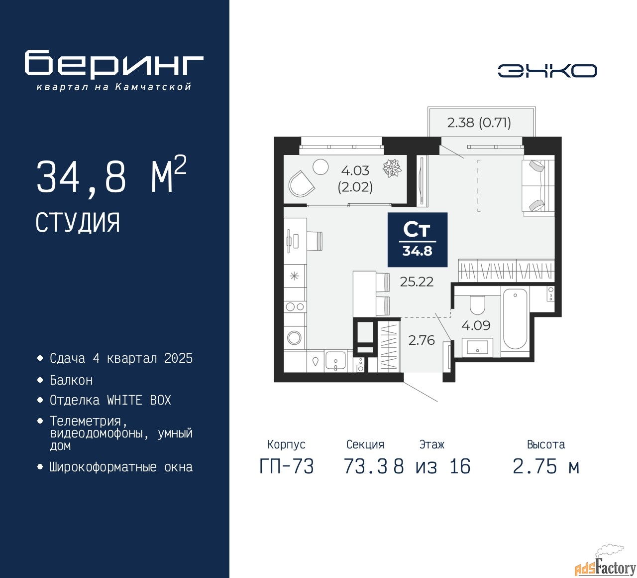 Дом монолитный, многоподъездный, переменной этажности, от 9 до 22 этажей. Квартира находится в 73.3-й секции высотой 16 этажей в корпусе ГП-73. На этаже 8 квартир. В подъезде 1 пассажирский и 1 грузовой лифт. Окончание строительства - 4 квартал 2025 года. Оформление сделки по договору долевого участия.