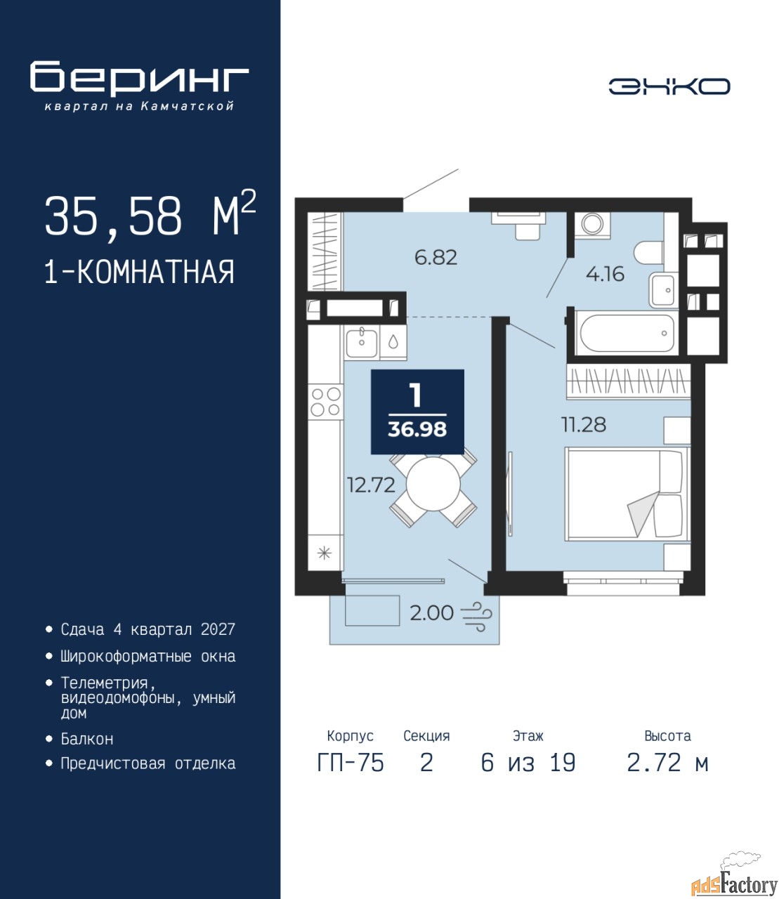 Дом монолитный, многоподъездный, переменной этажности, от 17 до 24 этажей. Квартира находится во 2-й секции высотой 19 этажей в корпусе ГП-75. На этаже 7 квартир. В подъезде 2 пассажирских и 1 грузовой лифт. Окончание строительства - 4 квартал 2027 года. Оформление сделки по договору долевого участия.