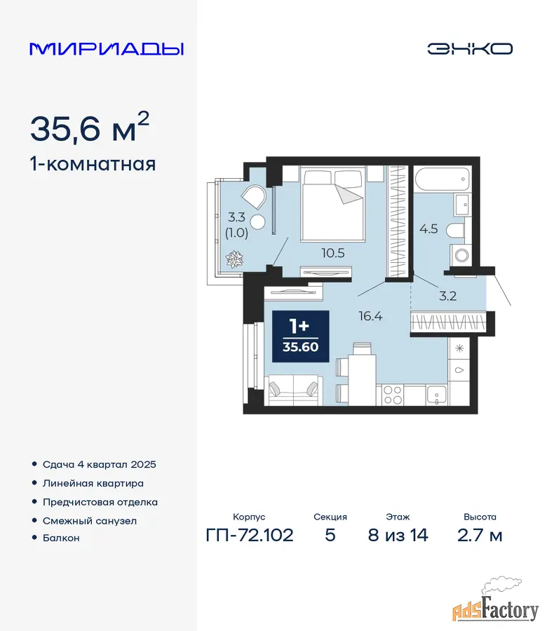 Дом монолитный, многоподъездный, переменной этажности, от 14 до 16 этажей. Квартира находится в 5-й секции высотой 14 этажей в корпусе ГП-72.102. На этаже 8 квартир. В подъезде 1 пассажирский и 1 грузовой лифт. Окончание строительства - 1 квартал 2026 года. Оформление сделки по договору долевого участия.