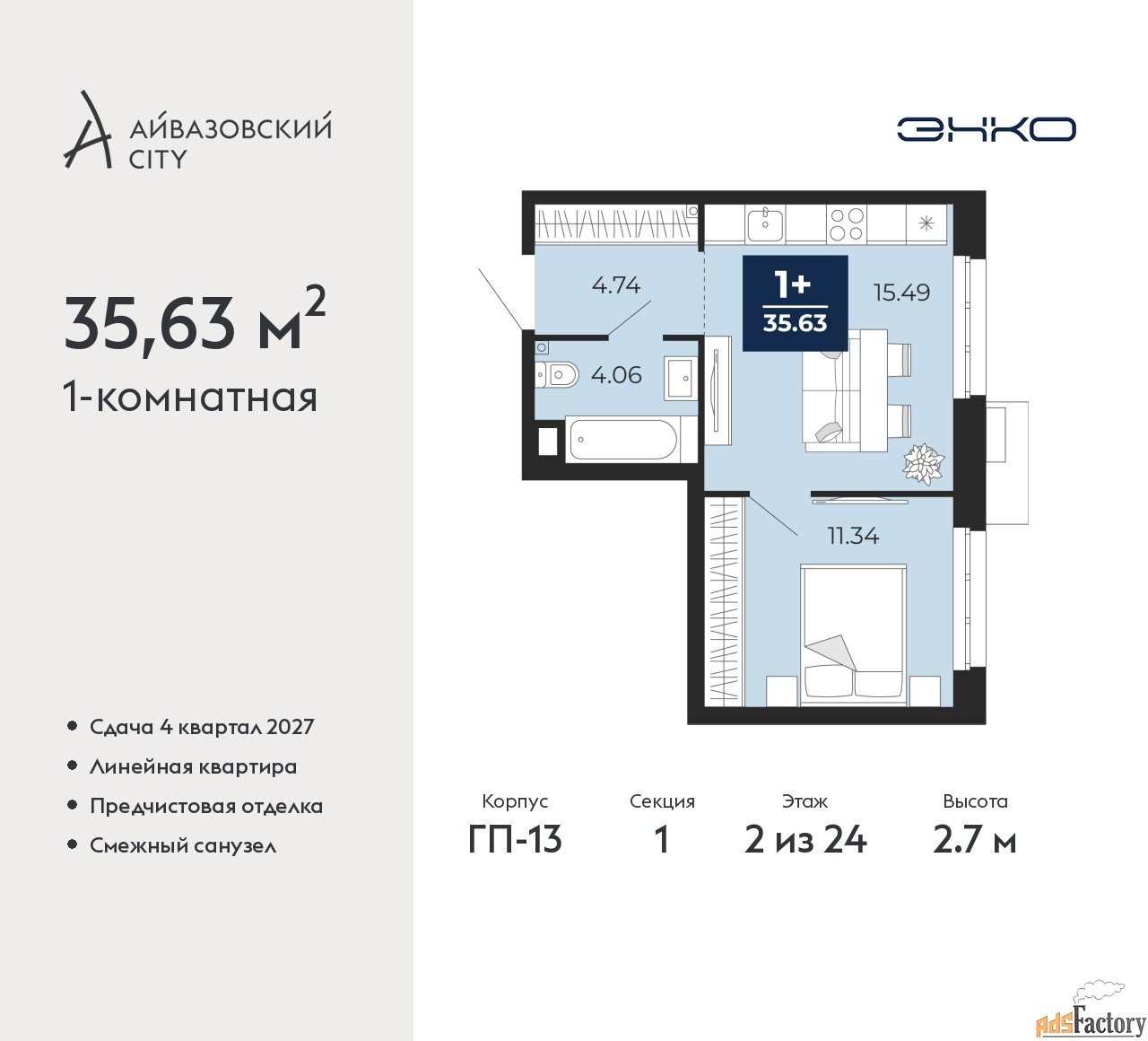 Дом монолитный, многоподъездный, высотой 24 этажа. Квартира находится в 1-й секции в корпусе ГП-13. На этаже 2 квартиры. Окончание строительства - 4 квартал 2027 года. Оформление сделки по договору долевого участия.