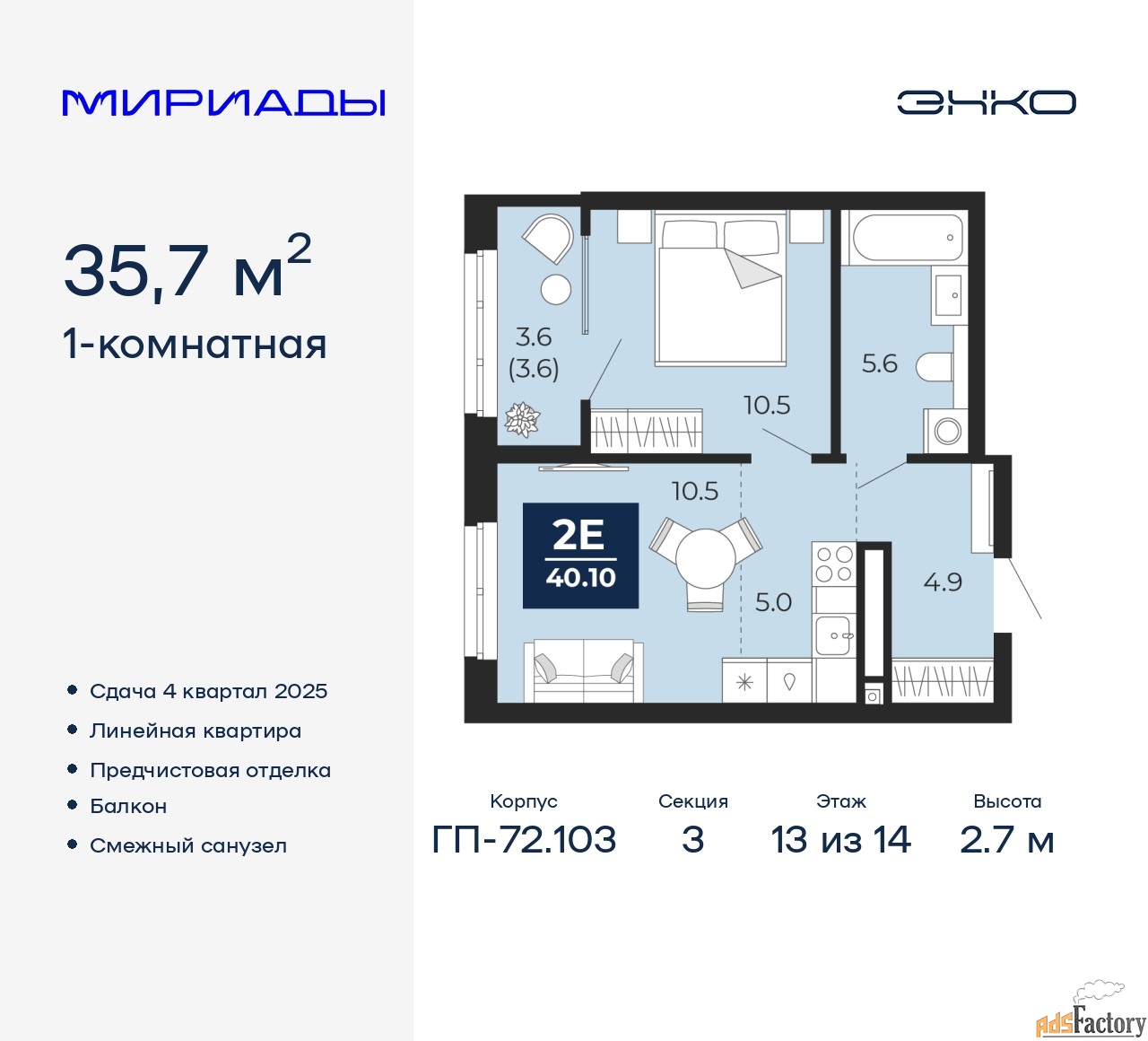 Дом монолитный, трехподъездный, переменной этажности, от 14 до 16 этажей. Квартира находится в 3-й секции высотой 14 этажей в корпусе ГП-72.103. На этаже 8 квартир. В подъезде 1 пассажирский и 1 грузовой лифт. Окончание строительства - 4 квартал 2025 года. Оформление сделки по договору долевого участия.