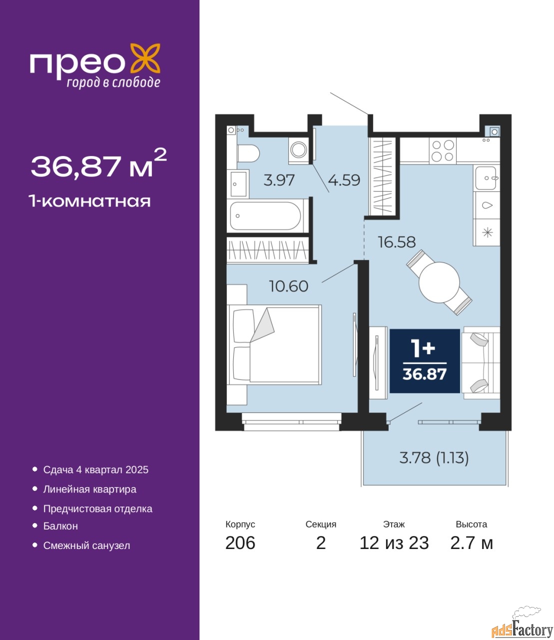 Дом монолитный, трехподъездный, переменной этажности, от 14 до 23 этажей. Квартира находится во 2-й секции высотой 23 этажа в корпусе 206. На этаже 10 квартир. В подъезде 1 пассажирский и 1 грузовой лифт. Окончание строительства - 1 квартал 2026 года. Оформление сделки по договору долевого участия.
