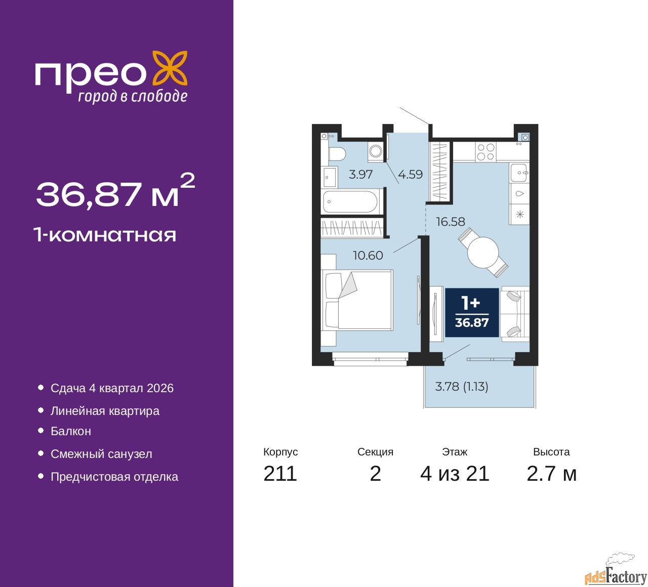 Дом монолитный, черырехподъездный, переменной этажности, от 14 до 21 этажей. Квартира находится во 2-й секции высотой 21 этаж в корпусе 211. На этаже 10 квартир. В подъезде 1 пассажирский и 1 грузовой лифт. Окончание строительства - 4 квартал 2026 года. Оформление сделки по договору долевого участия.