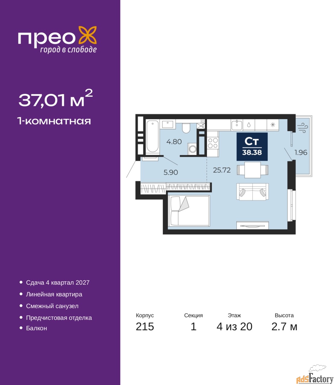 Квартира находится в корпусе 215. Дом монолитный, одноподъездный, высотой 20 этажей. На этаже 8 квартир. В подъезде 1 пассажирский и 1 грузовой лифт. Окончание строительства - 4 квартал 2027 года. Оформление сделки по договору долевого участия.