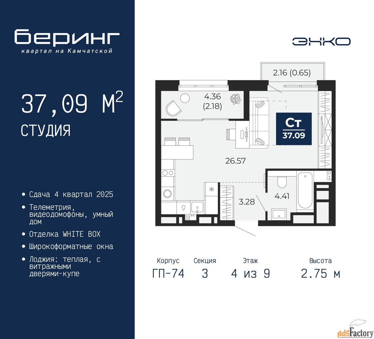 Дом монолитный, многоподъездный, переменной этажности, от 9 до 21 этажей. Квартира находится в 3-й секции высотой 9 этажей в корпусе ГП-74. На этаже 7 квартир. В подъезде 1 грузовой лифт. Окончание строительства - 4 квартал 2025 года. Оформление сделки по договору долевого участия.