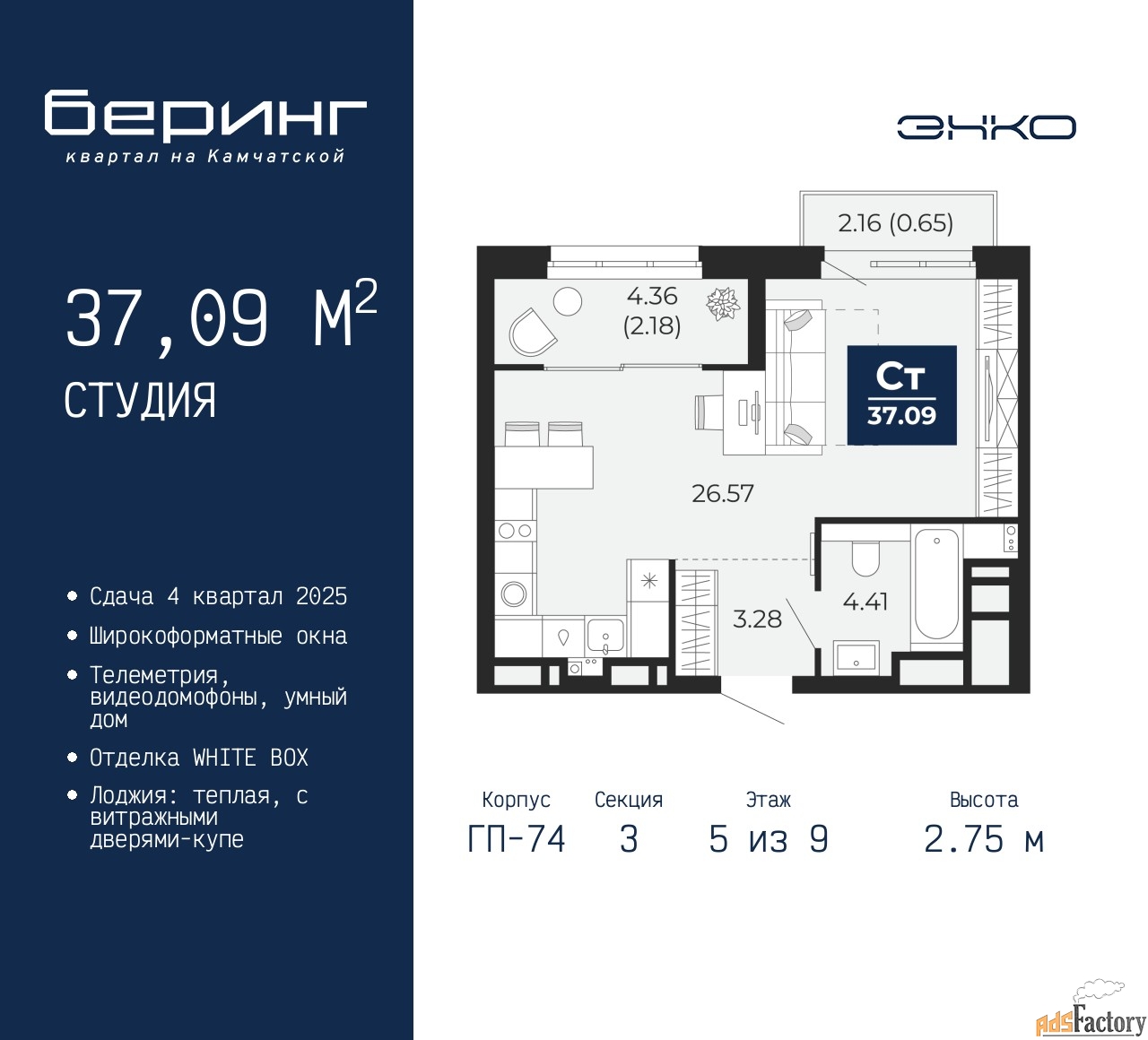 Дом монолитный, многоподъездный, переменной этажности, от 9 до 21 этажей. Квартира находится в 3-й секции высотой 9 этажей в корпусе ГП-74. На этаже 7 квартир. В подъезде 1 грузовой лифт. Окончание строительства - 4 квартал 2025 года. Оформление сделки по договору долевого участия.