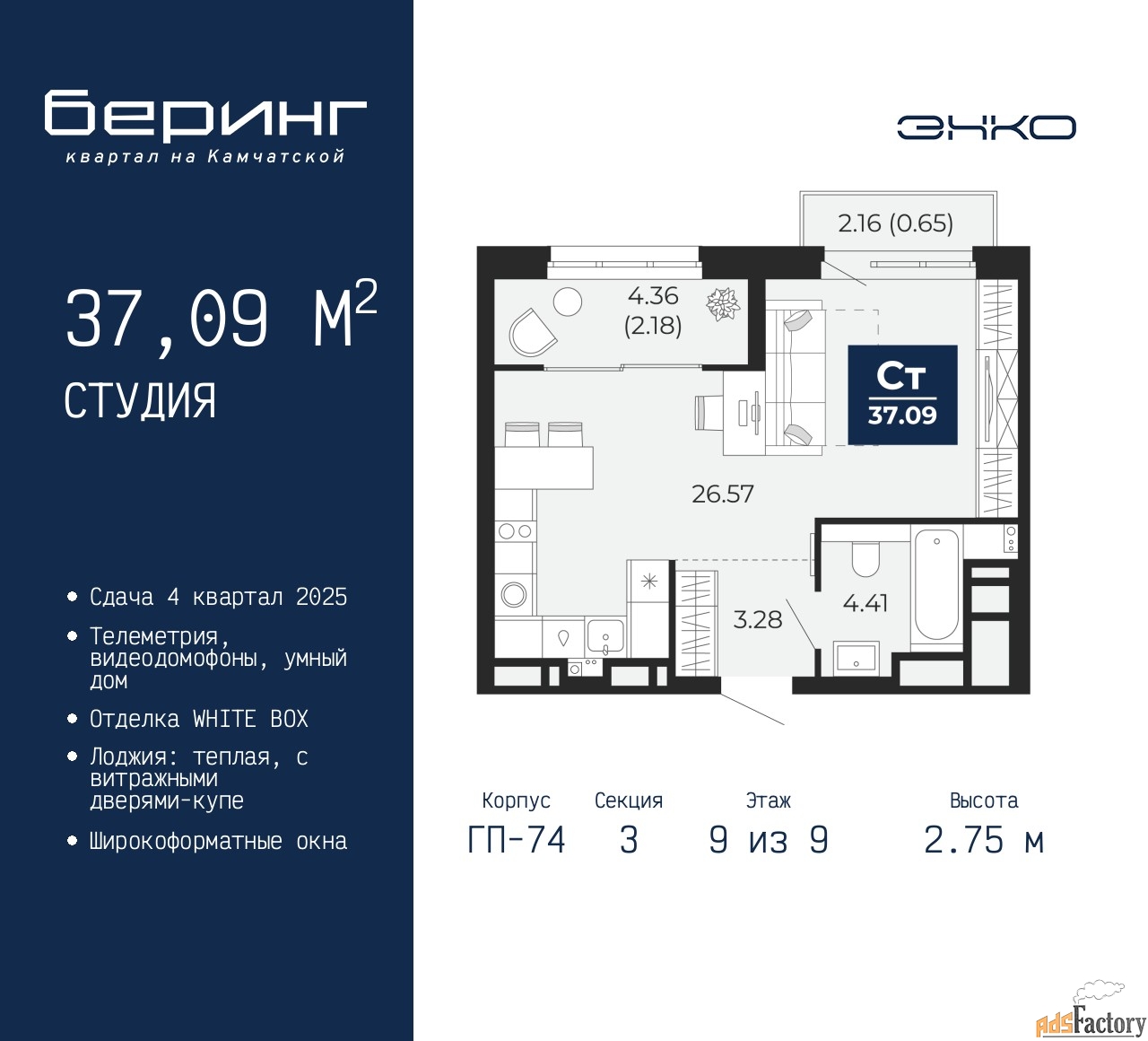 Дом монолитный, многоподъездный, переменной этажности, от 9 до 21 этажей. Квартира находится в 3-й секции высотой 9 этажей в корпусе ГП-74. На этаже 7 квартир. В подъезде 1 грузовой лифт. Окончание строительства - 1 квартал 2026 года. Оформление сделки по договору долевого участия.