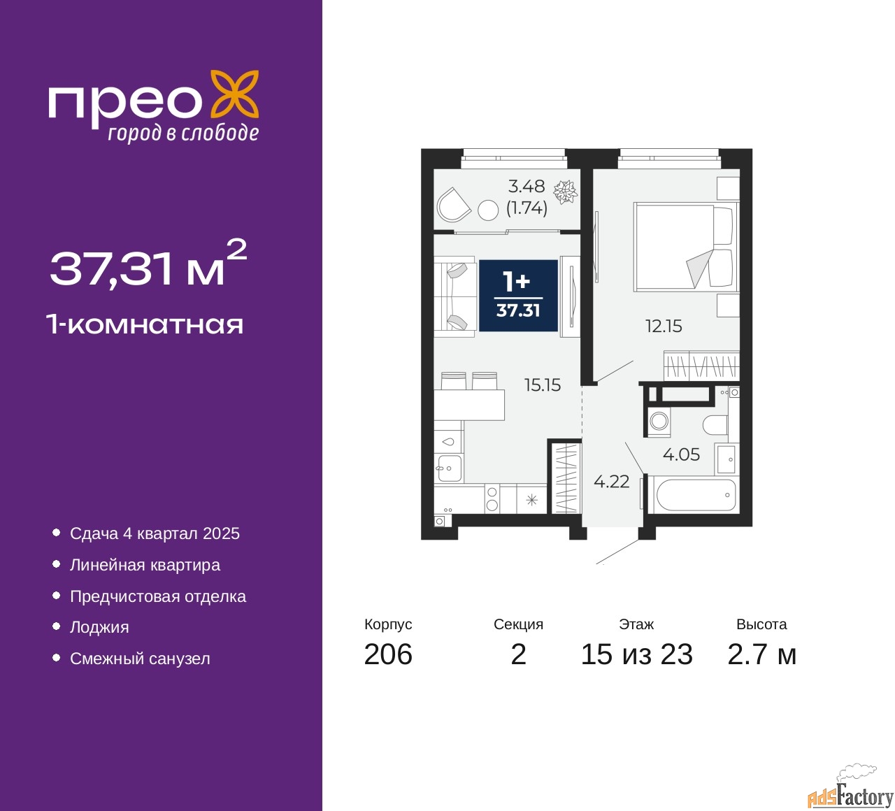 Дом монолитный, трехподъездный, переменной этажности, от 14 до 23 этажей. Квартира находится во 2-й секции высотой 23 этажа в корпусе 206. На этаже 10 квартир. В подъезде 1 пассажирский и 1 грузовой лифт. Окончание строительства - 4 квартал 2025 года. Оформление сделки по договору долевого участия.
