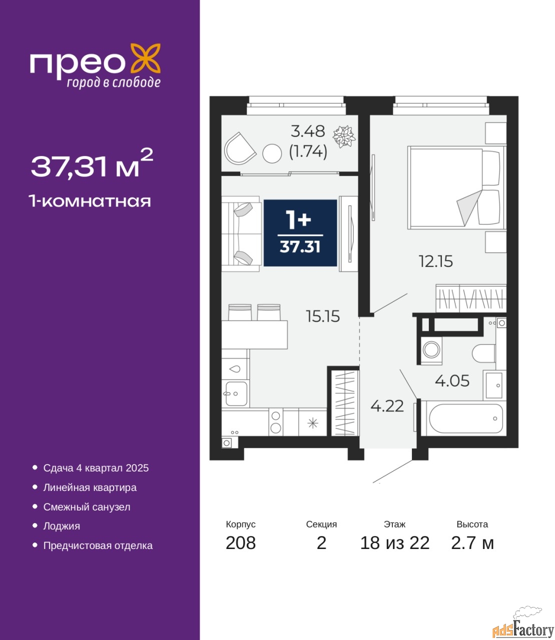 Дом монолитный, трехподъездный, переменной этажности, от 14 до 22 этажей. Квартира находится во 2-й секции высотой 22 этажа в корпусе 208. На этаже 10 квартир. В подъезде 1 пассажирский и 1 грузовой лифт. Окончание строительства - 4 квартал 2025 года. Оформление сделки по договору долевого участия.