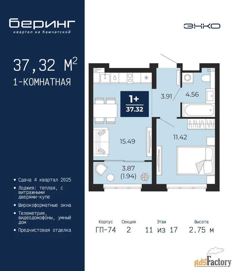 Дом монолитный, многоподъездный, переменной этажности, от 9 до 21 этажей. Квартира находится во 2-й секции высотой 17 этажей в корпусе ГП-74. На этаже 7 квартир. В подъезде 1 пассажирский и 1 грузовой лифт. Окончание строительства - 1 квартал 2026 года. Оформление сделки по договору долевого участия.