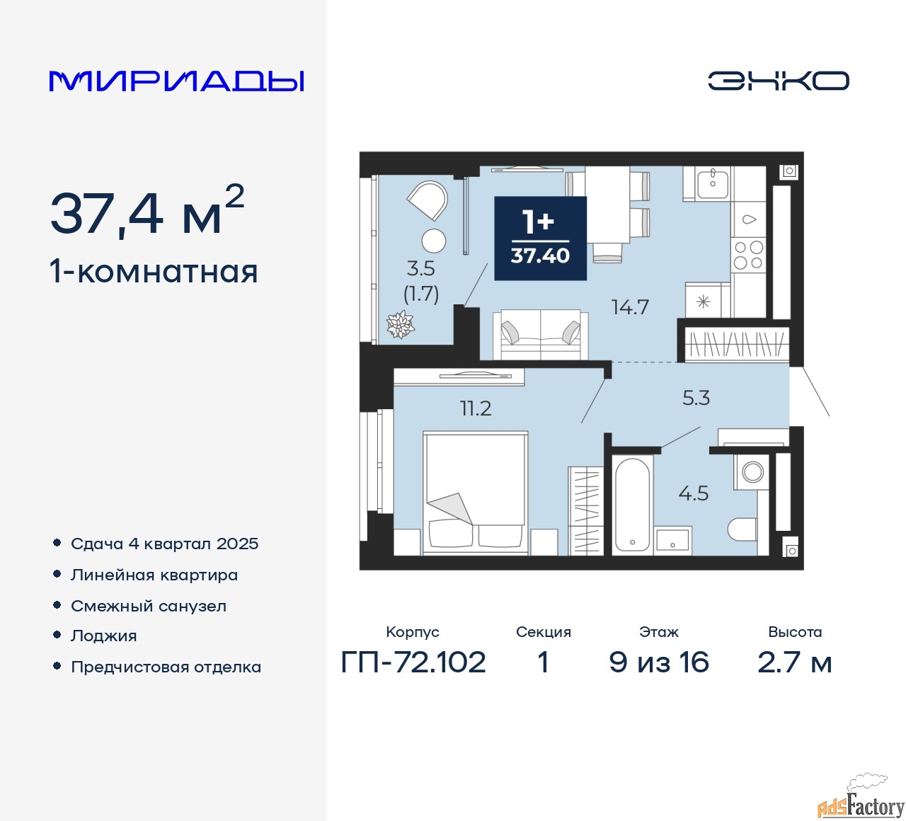Дом монолитный, многоподъездный, переменной этажности, от 14 до 16 этажей. Квартира находится в 1-й секции высотой 16 этажей в корпусе ГП-72.102. На этаже 9 квартир. В подъезде 1 пассажирский и 1 грузовой лифт. Окончание строительства - 4 квартал 2025 года. Оформление сделки по договору долевого участия.