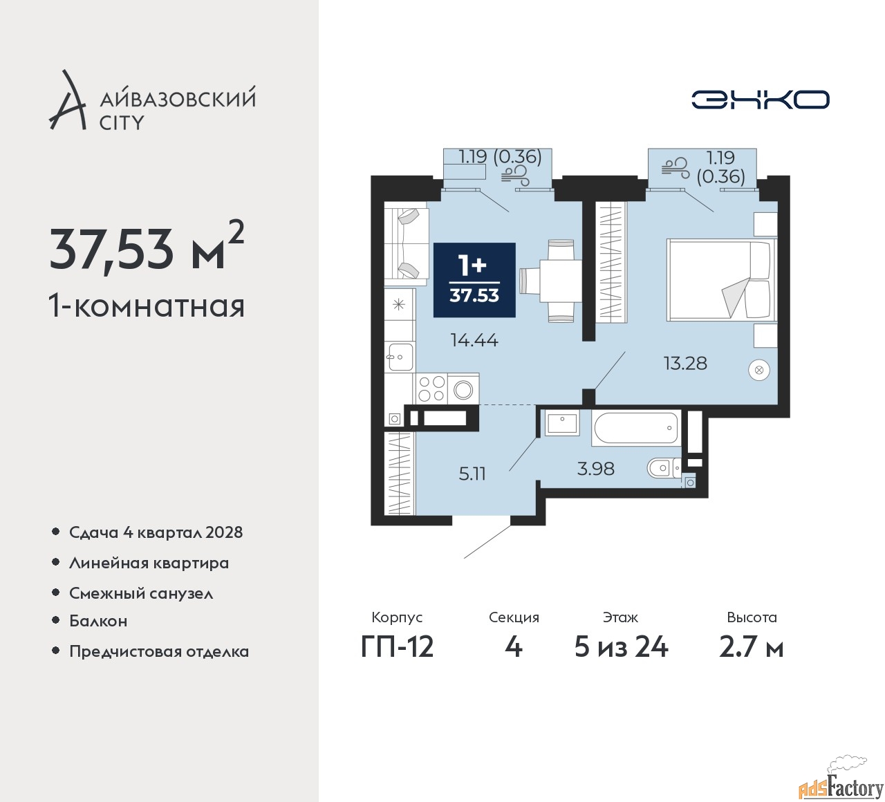 Дом монолитный, многоподъездный, высотой 24 этажа. Квартира находится в 4-й секции в корпусе ГП-12. На этаже 5 квартир. В подъезде 1 пассажирский и 1 грузовой лифт. Окончание строительства - 4 квартал 2028 года. Оформление сделки по договору долевого участия.