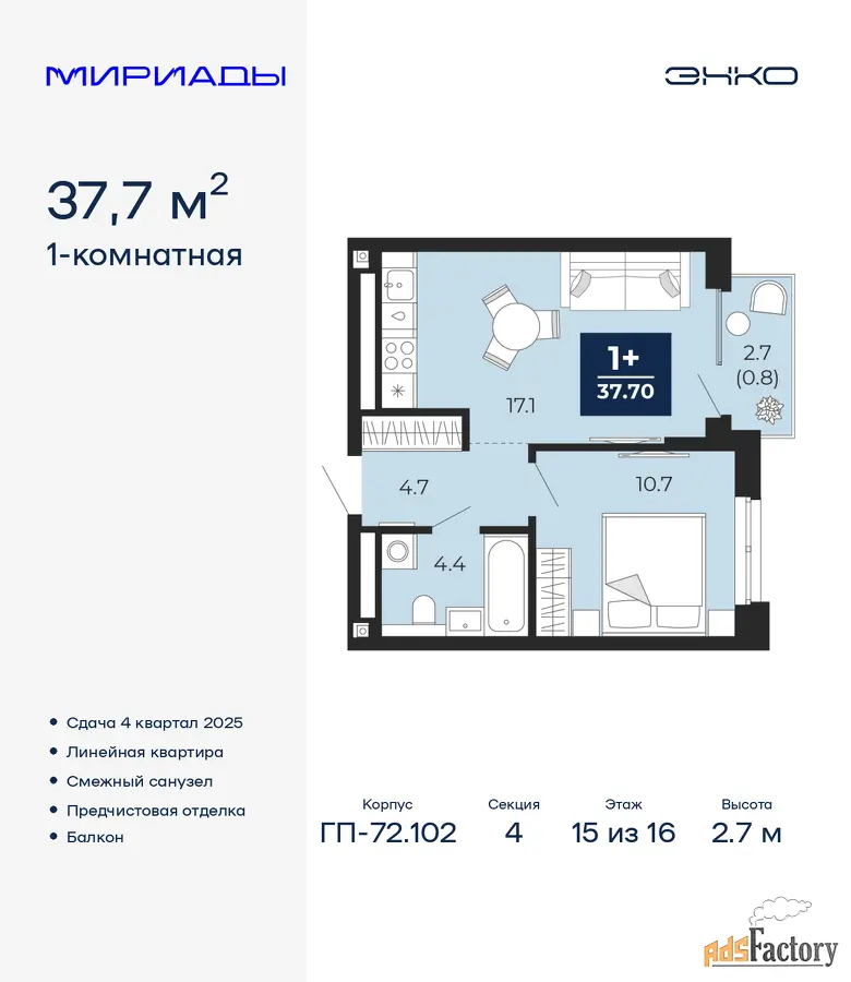 Дом монолитный, многоподъездный, переменной этажности, от 14 до 16 этажей. Квартира находится в 4-й секции высотой 16 этажей в корпусе ГП-72.102. На этаже 6 квартир. В подъезде 1 пассажирский и 1 грузовой лифт. Окончание строительства - 1 квартал 2026 года. Оформление сделки по договору долевого участия.