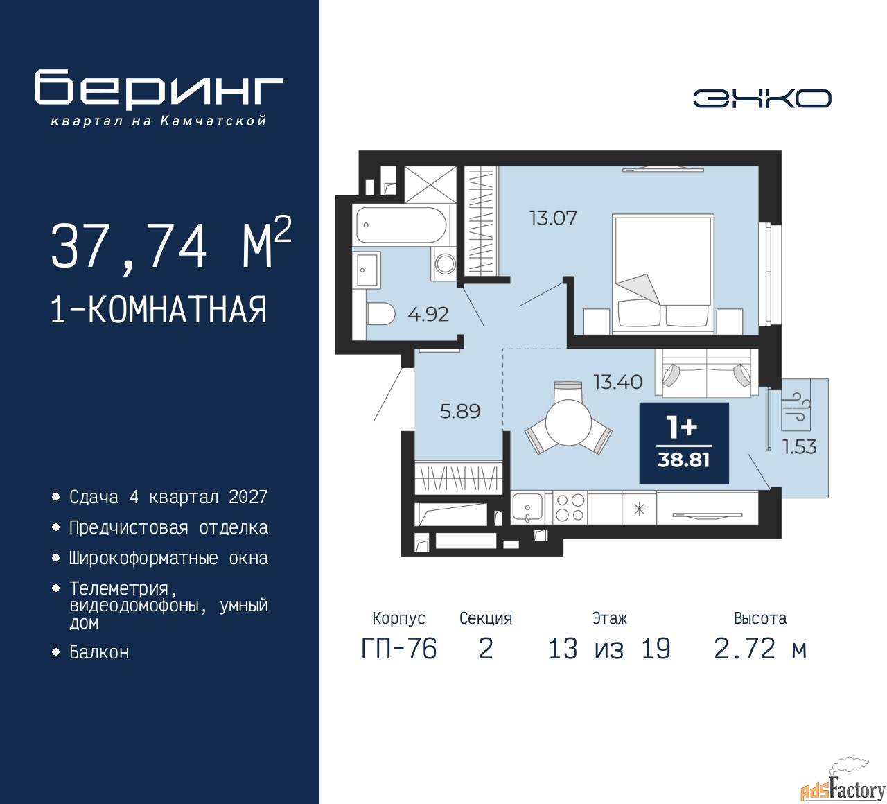Дом монолитный, черырехподъездный, переменной этажности, от 19 до 24 этажей. Квартира находится во 2-й секции высотой 19 этажей в корпусе ГП-76. На этаже 8 квартир. В подъезде 1 пассажирский и 1 грузовой лифт. Окончание строительства - 4 квартал 2027 года. Оформление сделки по договору долевого участия.