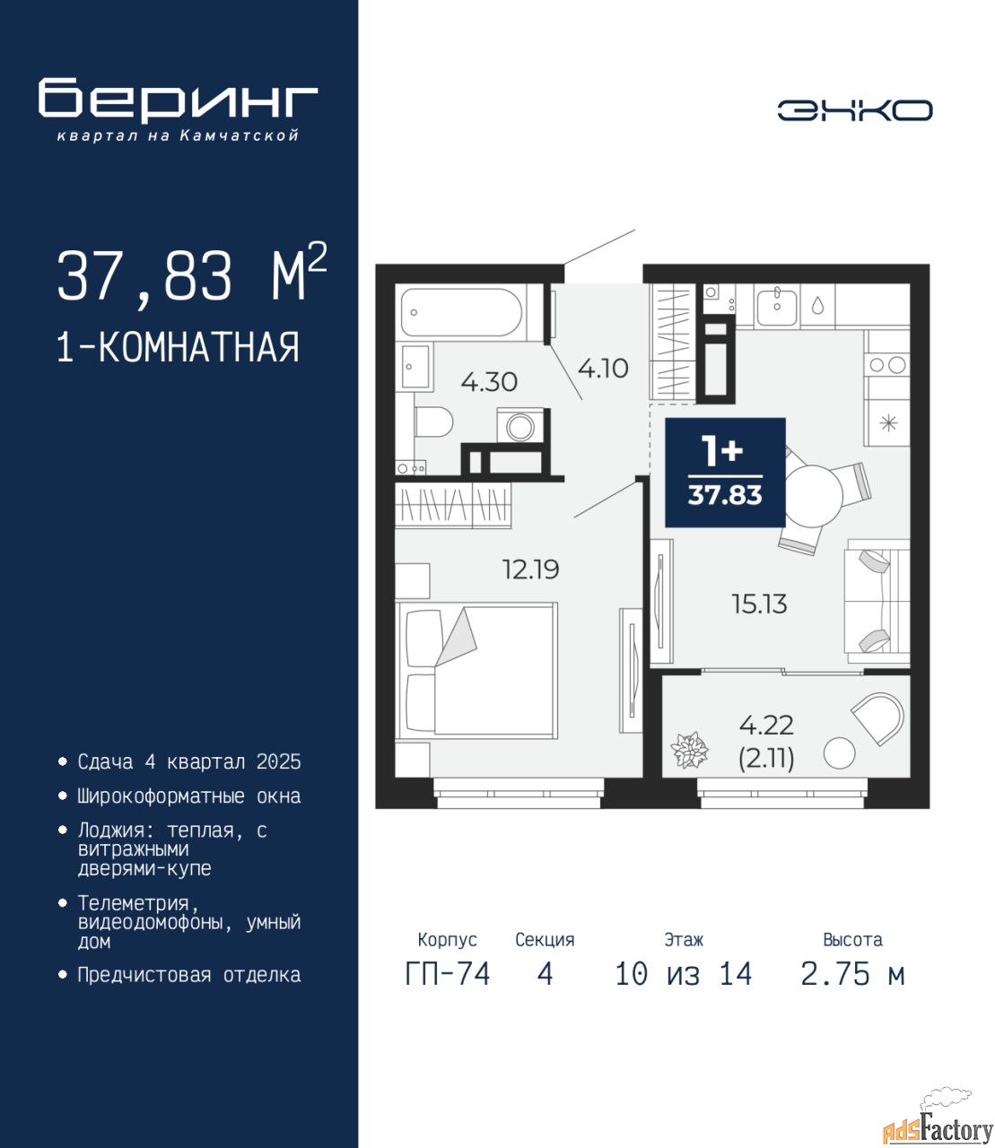 Дом монолитный, многоподъездный, переменной этажности, от 9 до 21 этажей. Квартира находится в 4-й секции высотой 14 этажей в корпусе ГП-74. На этаже 7 квартир. В подъезде 1 пассажирский и 1 грузовой лифт. Окончание строительства - 4 квартал 2025 года. Оформление сделки по договору долевого участия.