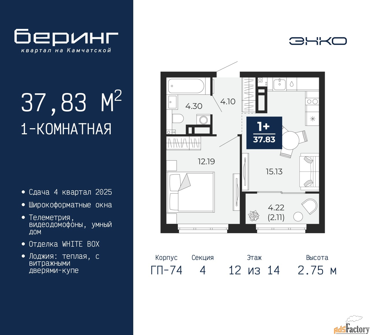 Дом монолитный, многоподъездный, переменной этажности, от 9 до 21 этажей. Квартира находится в 4-й секции высотой 14 этажей в корпусе ГП-74. На этаже 7 квартир. В подъезде 1 пассажирский и 1 грузовой лифт. Окончание строительства - 4 квартал 2025 года. Оформление сделки по договору долевого участия.