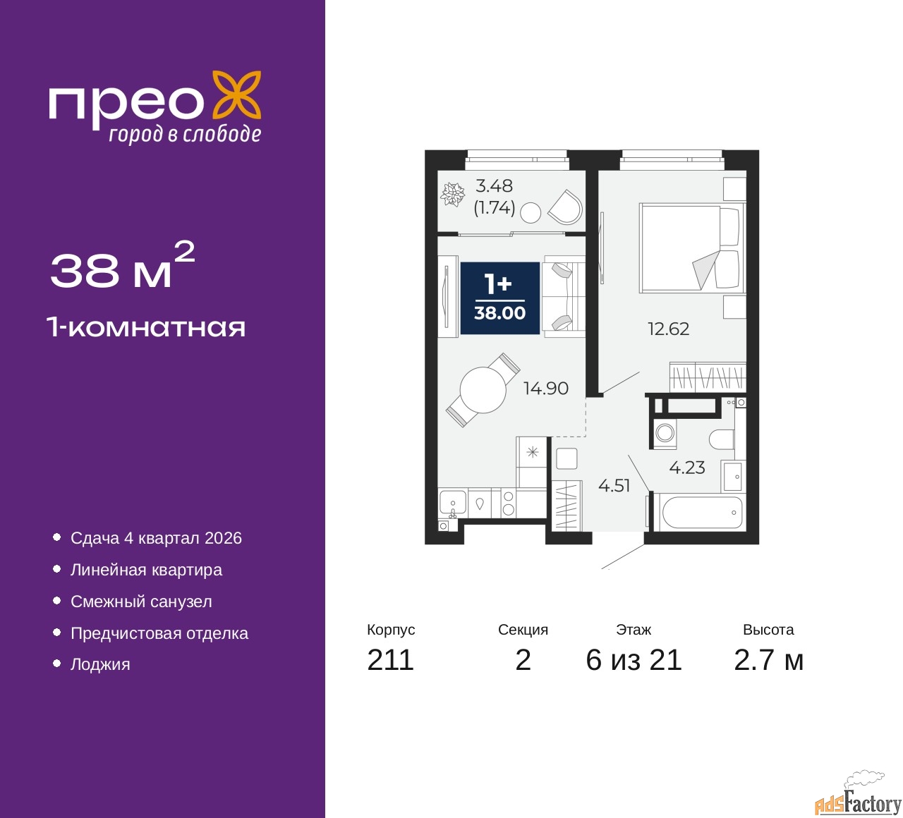 Дом монолитный, черырехподъездный, переменной этажности, от 14 до 21 этажей. Квартира находится во 2-й секции высотой 21 этаж в корпусе 211. На этаже 10 квартир. В подъезде 1 пассажирский и 1 грузовой лифт. Окончание строительства - 4 квартал 2026 года. Оформление сделки по договору долевого участия.