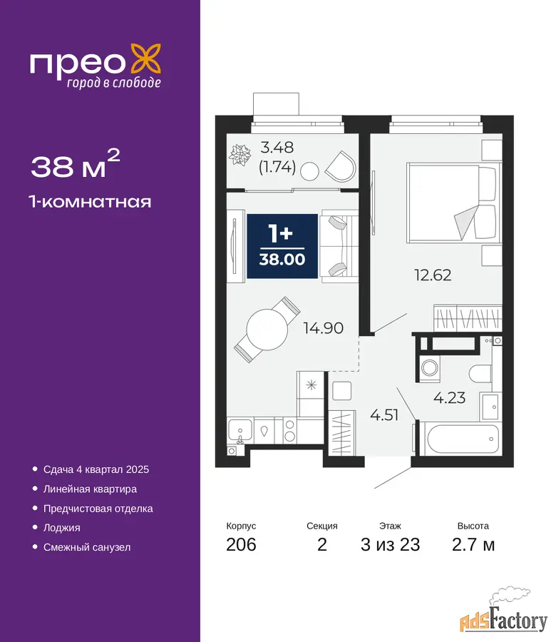 Дом монолитный, трехподъездный, переменной этажности, от 14 до 23 этажей. Квартира находится во 2-й секции высотой 23 этажа в корпусе 206. На этаже 10 квартир. В подъезде 1 пассажирский и 1 грузовой лифт. Окончание строительства - 1 квартал 2026 года. Оформление сделки по договору долевого участия.