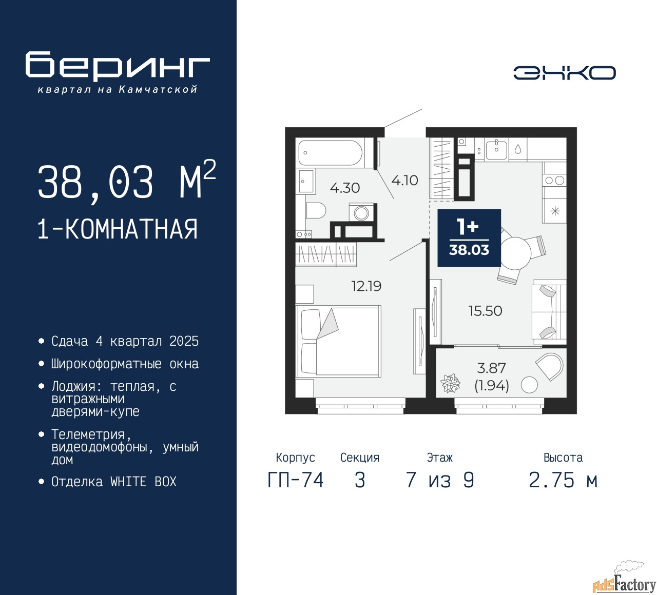 Дом монолитный, многоподъездный, переменной этажности, от 9 до 21 этажей. Квартира находится в 3-й секции высотой 9 этажей в корпусе ГП-74. На этаже 7 квартир. В подъезде 1 грузовой лифт. Окончание строительства - 1 квартал 2026 года. Оформление сделки по договору долевого участия.