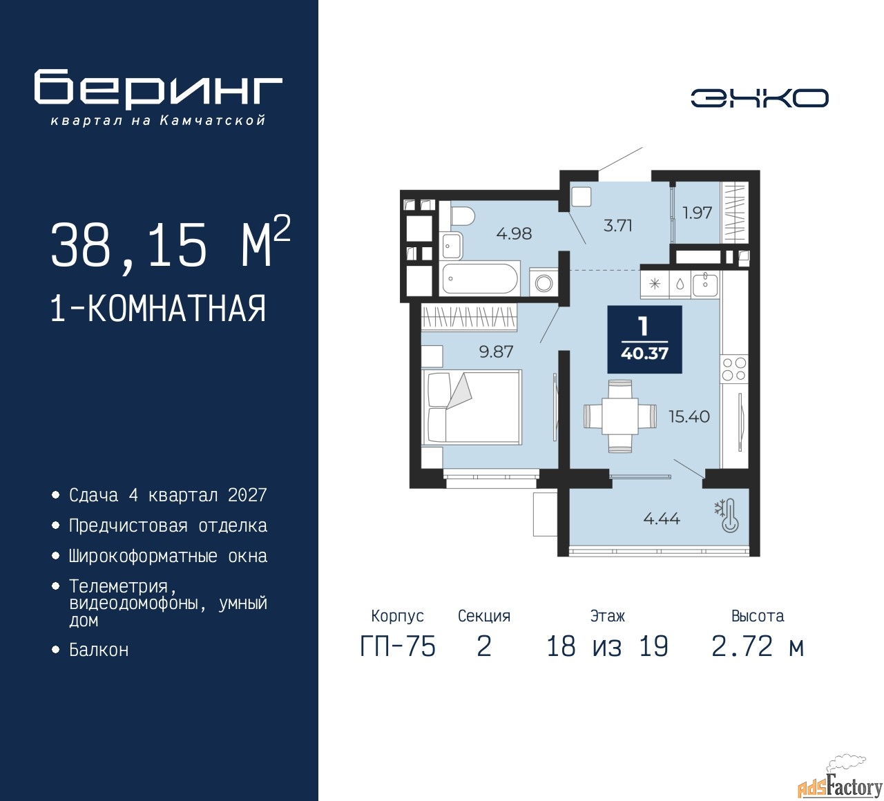 | Высота потолков (м.) | 2.72 |
