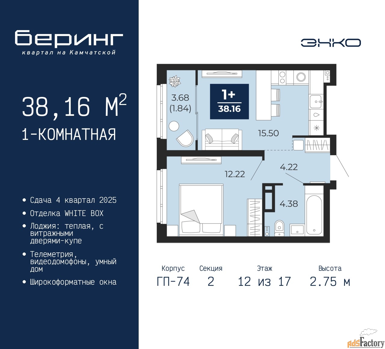 Дом монолитный, многоподъездный, переменной этажности, от 9 до 21 этажей. Квартира находится во 2-й секции высотой 17 этажей в корпусе ГП-74. На этаже 7 квартир. В подъезде 1 пассажирский и 1 грузовой лифт. Окончание строительства - 4 квартал 2025 года. Оформление сделки по договору долевого участия.