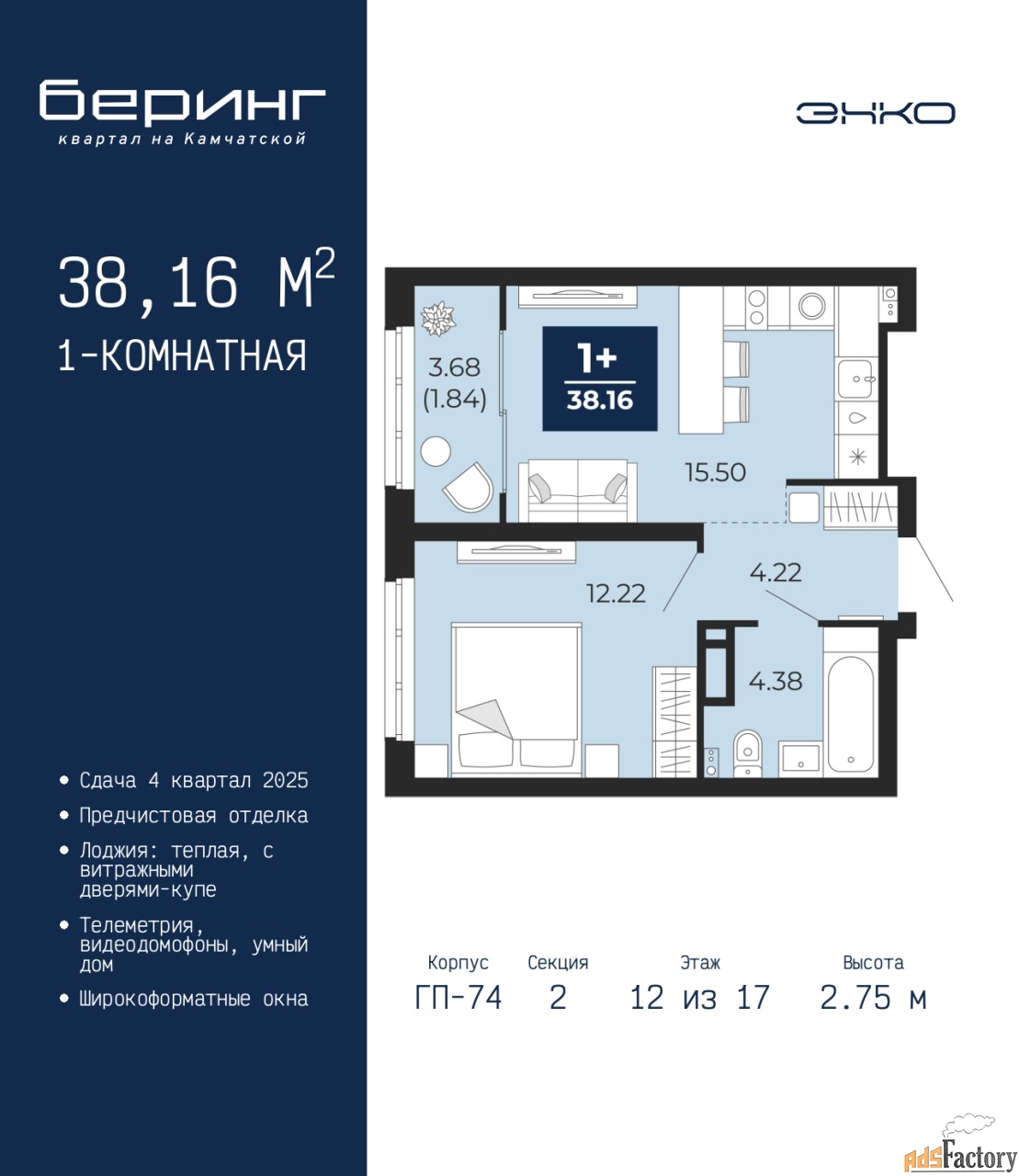 Дом монолитный, многоподъездный, переменной этажности, от 9 до 21 этажей. Квартира находится во 2-й секции высотой 17 этажей в корпусе ГП-74. На этаже 7 квартир. В подъезде 1 пассажирский и 1 грузовой лифт. Окончание строительства - 4 квартал 2025 года. Оформление сделки по договору долевого участия.
