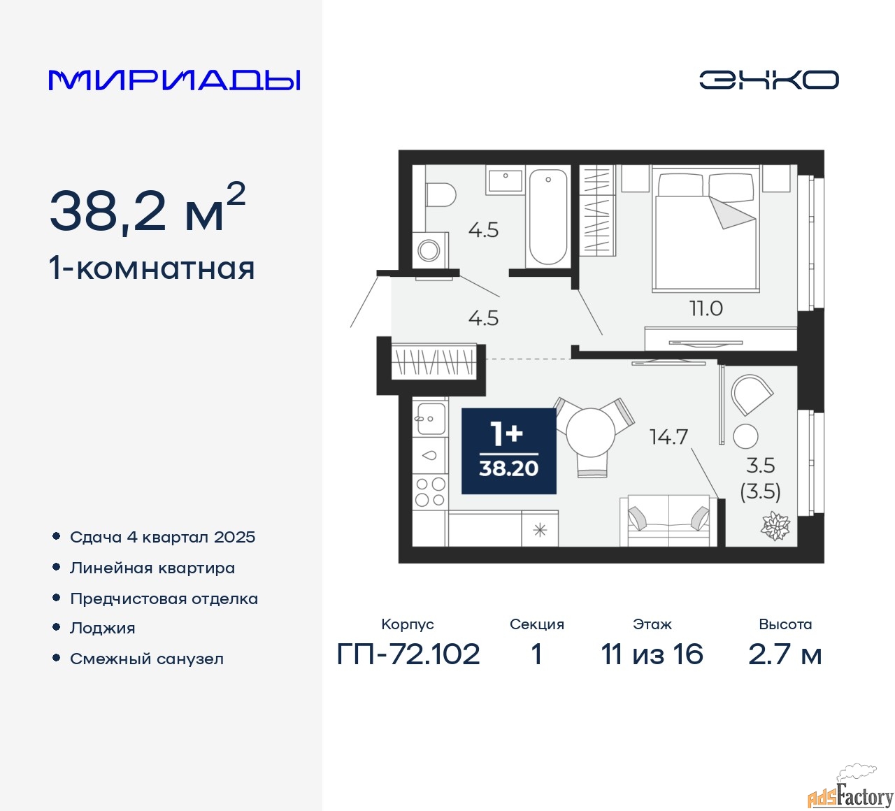 Дом монолитный, многоподъездный, переменной этажности, от 14 до 16 этажей. Квартира находится в 1-й секции высотой 16 этажей в корпусе ГП-72.102. На этаже 9 квартир. В подъезде 1 пассажирский и 1 грузовой лифт. Окончание строительства - 4 квартал 2025 года. Оформление сделки по договору долевого участия.