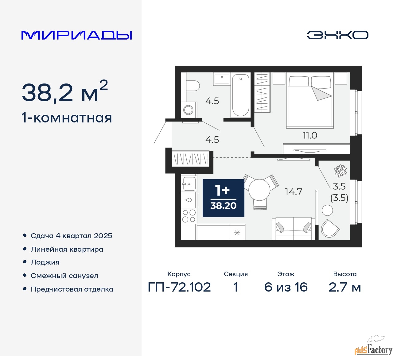 Дом монолитный, многоподъездный, переменной этажности, от 14 до 16 этажей. Квартира находится в 1-й секции высотой 16 этажей в корпусе ГП-72.102. На этаже 9 квартир. В подъезде 1 пассажирский и 1 грузовой лифт. Окончание строительства - 4 квартал 2025 года. Оформление сделки по договору долевого участия.
