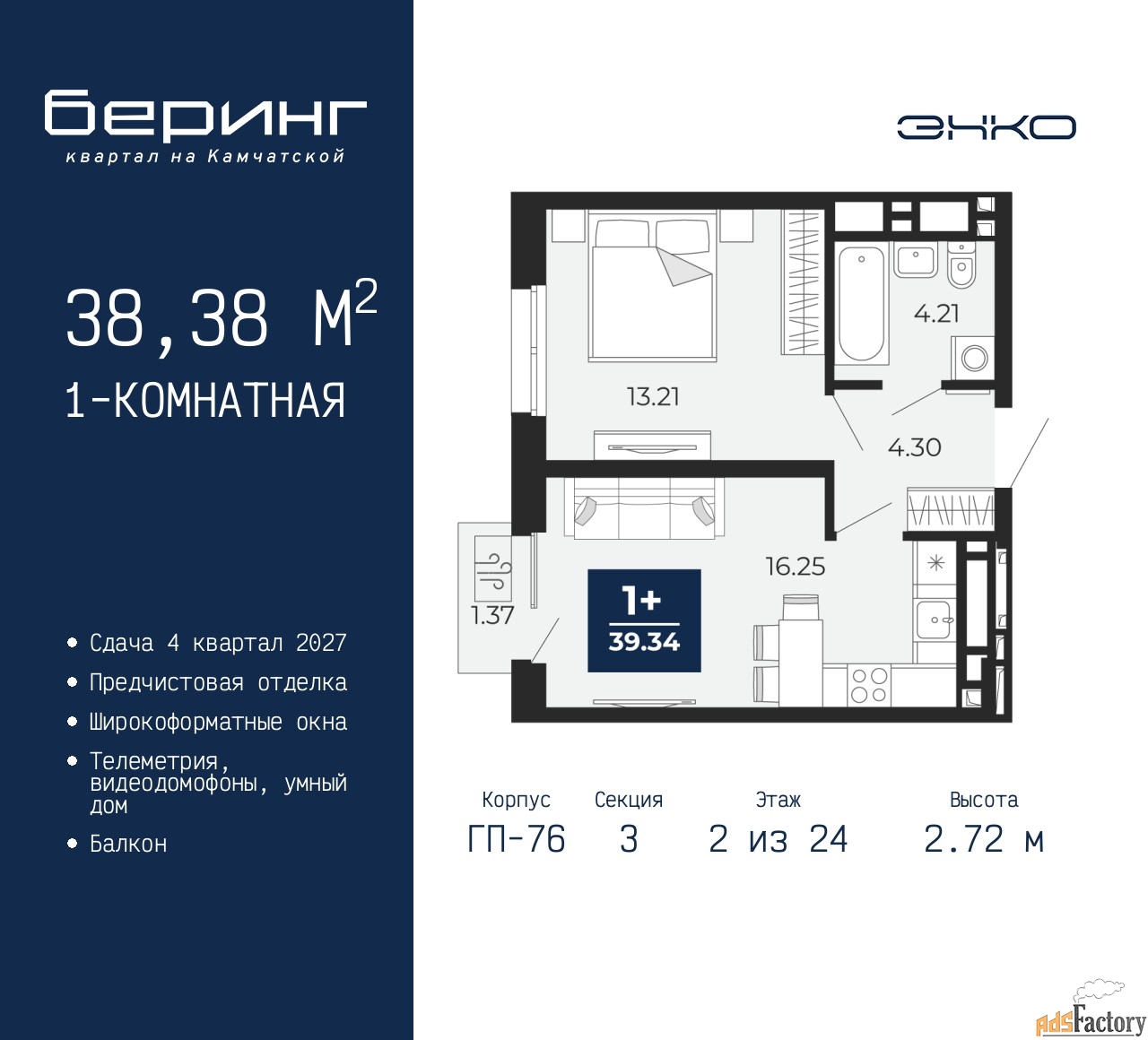 Дом монолитный, черырехподъездный, переменной этажности, от 19 до 24 этажей. Квартира находится в 3-й секции высотой 24 этажа в корпусе ГП-76. На этаже 6 квартир. В подъезде 1 пассажирский и 1 грузовой лифт. Окончание строительства - 4 квартал 2027 года. Оформление сделки по договору долевого участия.