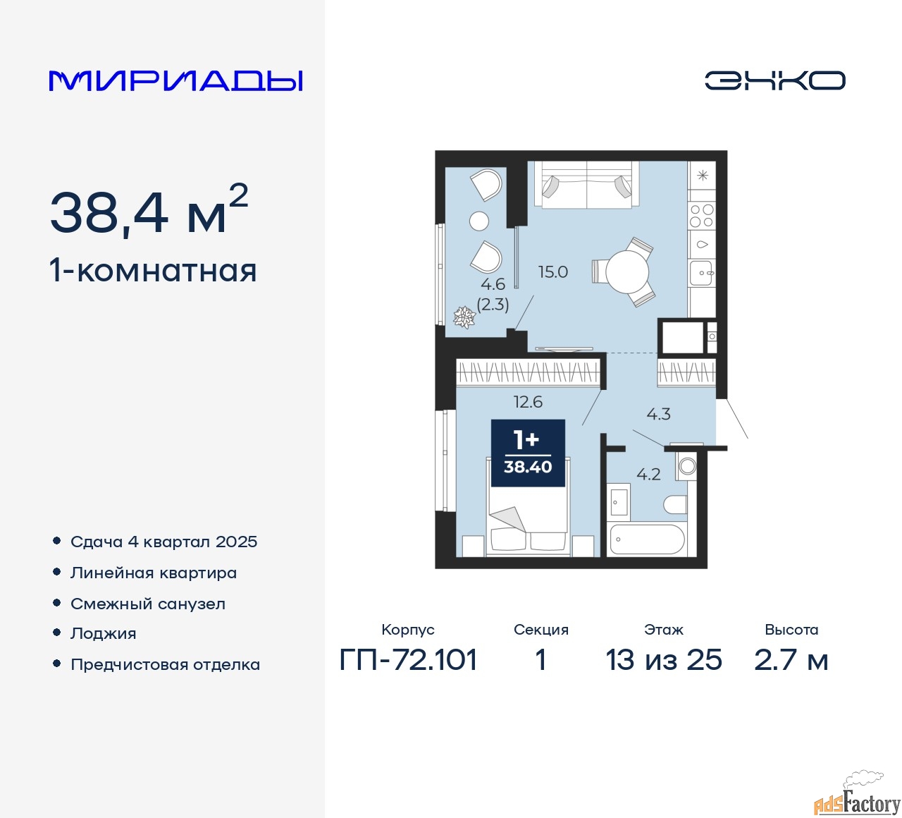 Квартира находится в корпусе ГП-72.101. Дом монолитный, одноподъездный, высотой 25 этажей. На этаже 8 квартир. В подъезде 2 пассажирских и 1 грузовой лифт. Окончание строительства - 4 квартал 2025 года. Оформление сделки по договору долевого участия.