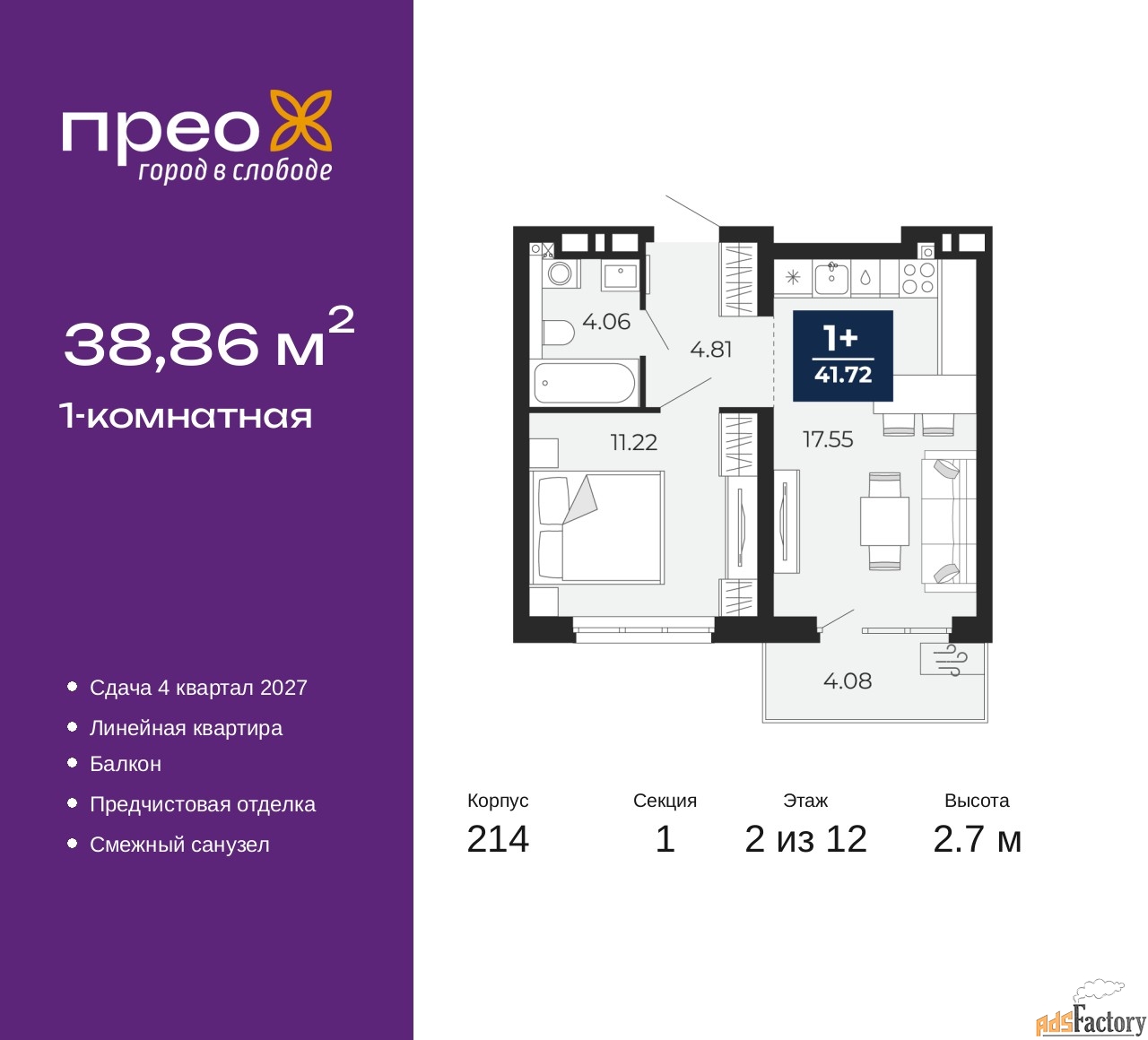 Дом монолитный, двухподъездный, переменной этажности, от 12 до 20 этажей. Квартира находится в 1-й секции высотой 12 этажей в корпусе 214. На этаже 8 квартир. В подъезде 1 пассажирский и 1 грузовой лифт. Окончание строительства - 4 квартал 2027 года. Оформление сделки по договору долевого участия.