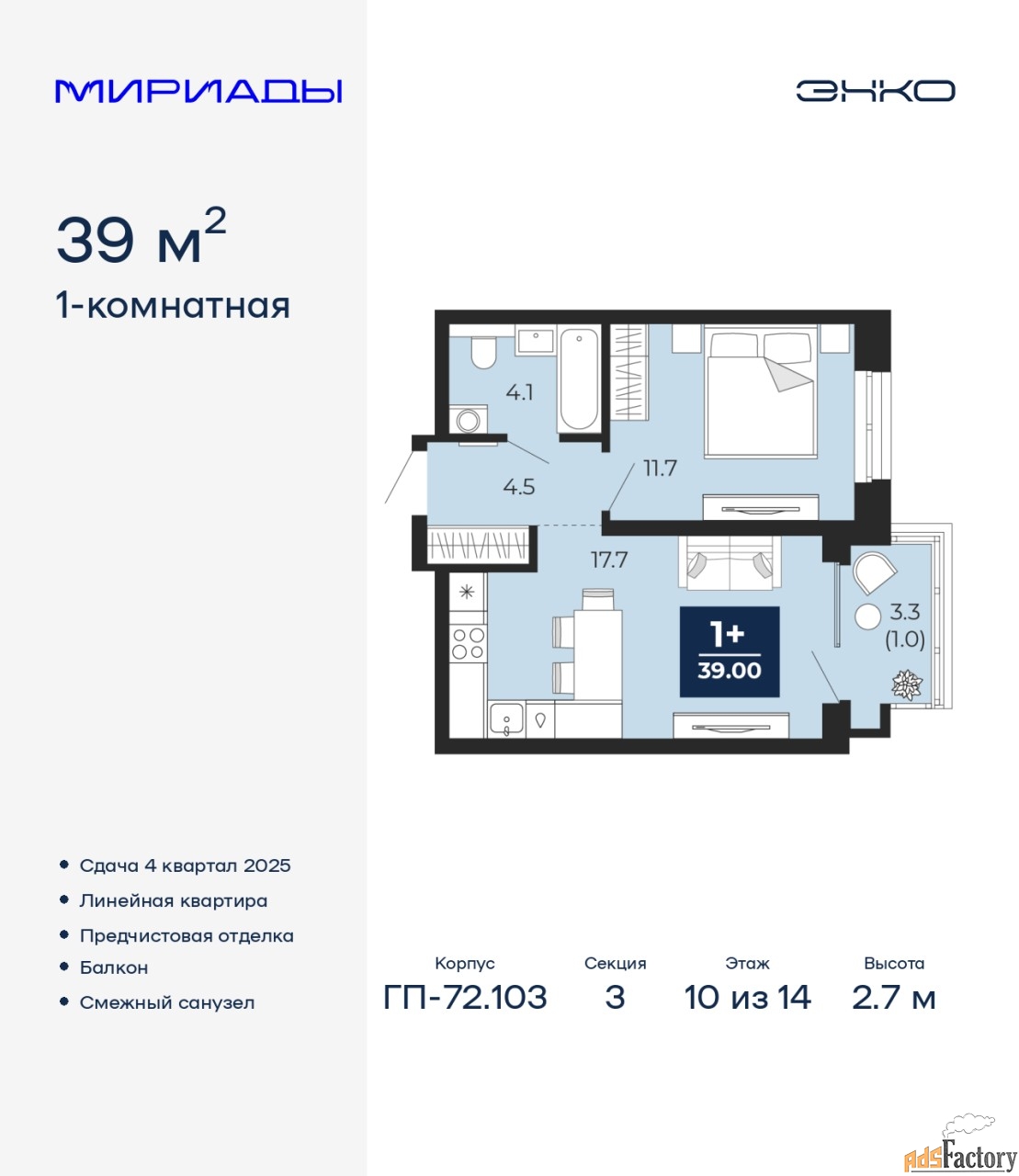 | Высота потолков (м.) | 2.7 |