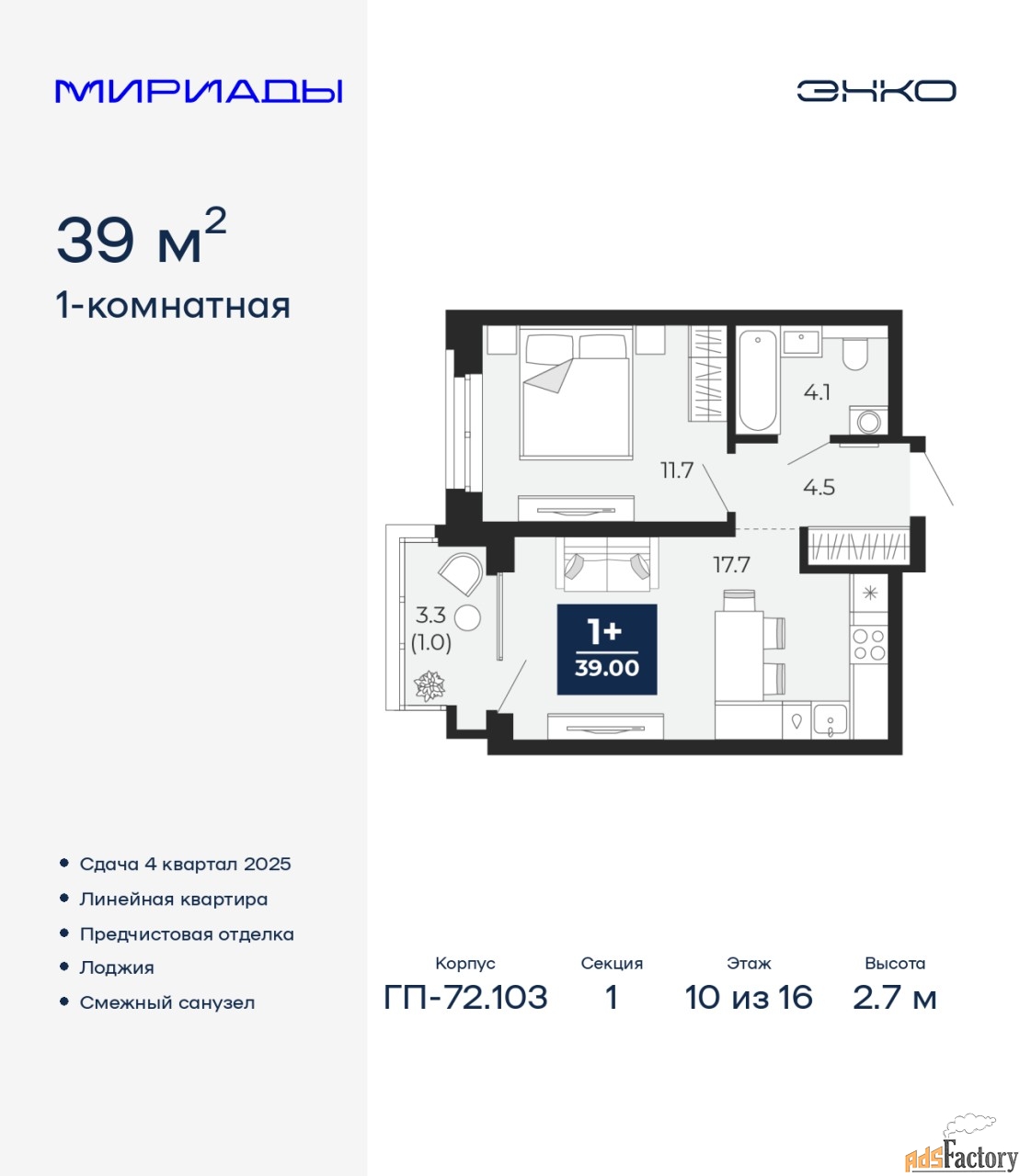 | Высота потолков (м.) | 2.7 |