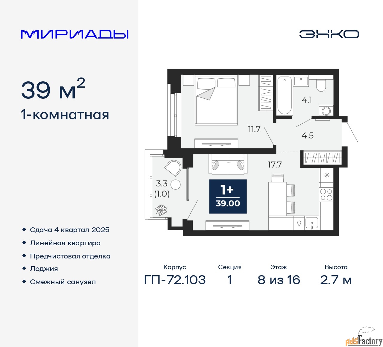 | Высота потолков (м.) | 2.7 |