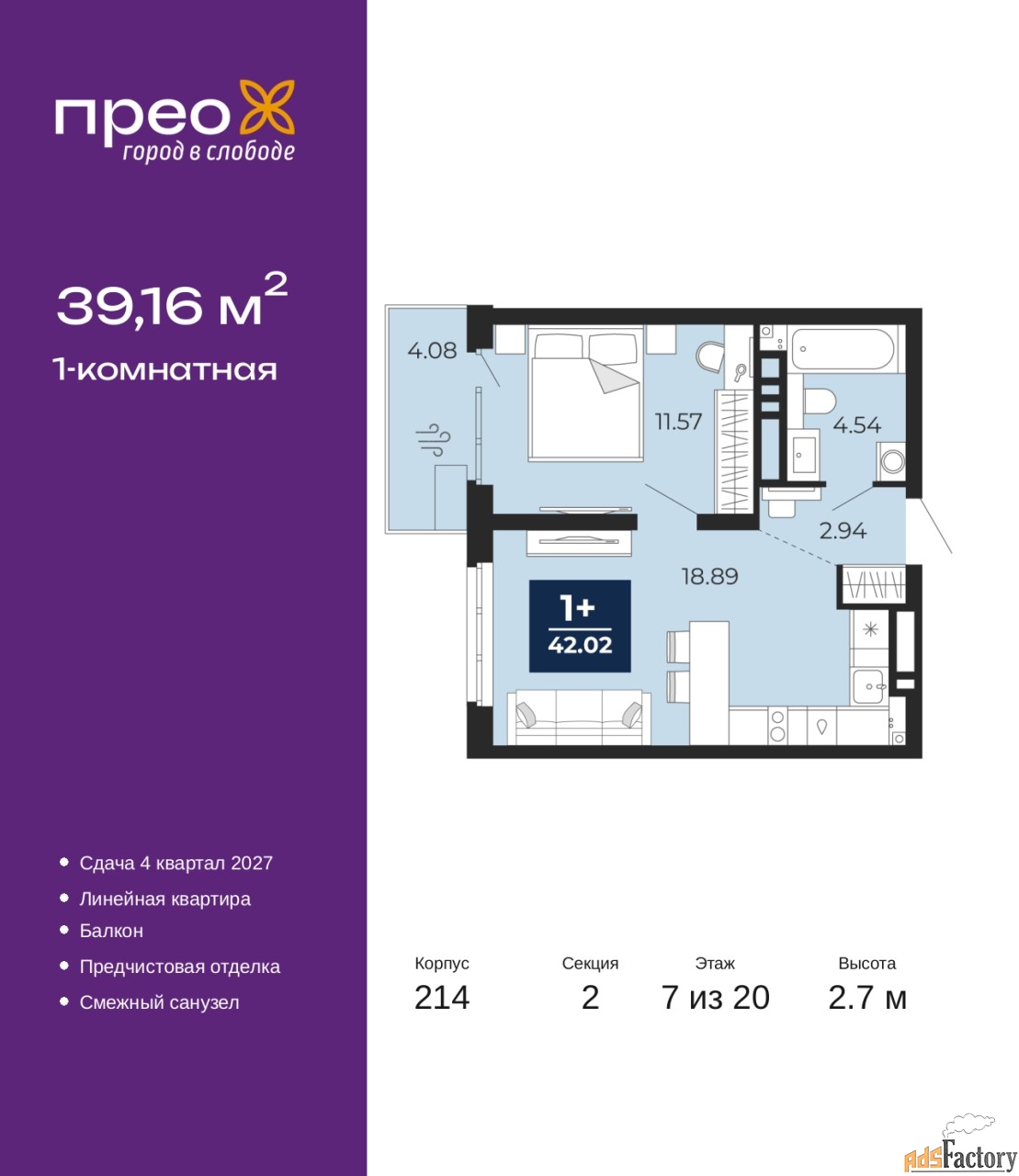 Дом монолитный, двухподъездный, переменной этажности, от 12 до 20 этажей. Квартира находится во 2-й секции высотой 20 этажей в корпусе 214. На этаже 8 квартир. В подъезде 1 пассажирский и 1 грузовой лифт. Окончание строительства - 4 квартал 2027 года. Оформление сделки по договору долевого участия.