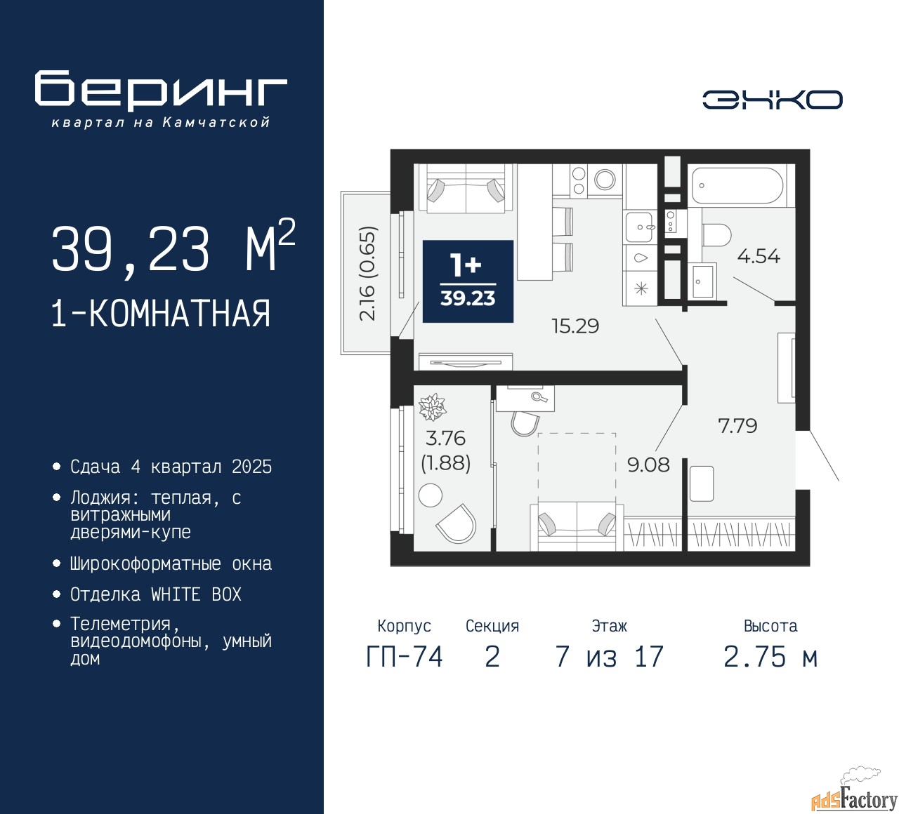 Дом монолитный, многоподъездный, переменной этажности, от 9 до 21 этажей. Квартира находится во 2-й секции высотой 17 этажей в корпусе ГП-74. На этаже 7 квартир. В подъезде 1 пассажирский и 1 грузовой лифт. Окончание строительства - 4 квартал 2025 года. Оформление сделки по договору долевого участия.