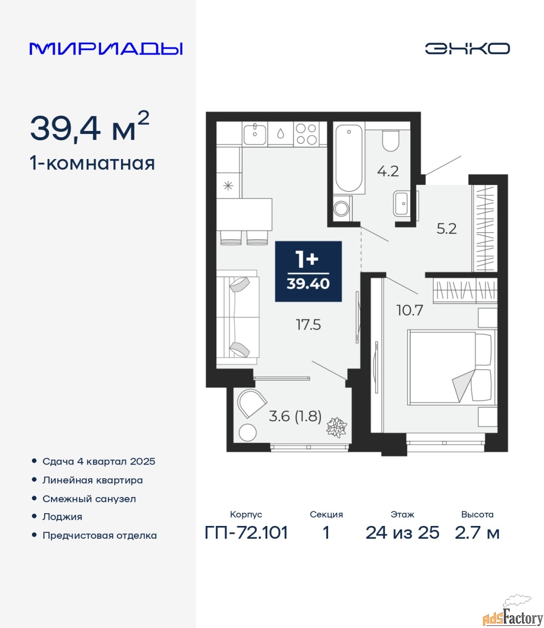Квартира находится в корпусе ГП-72.101. Дом монолитный, одноподъездный, высотой 25 этажей. На этаже 8 квартир. В подъезде 2 пассажирских и 1 грузовой лифт. Окончание строительства - 4 квартал 2025 года. Оформление сделки по договору долевого участия.