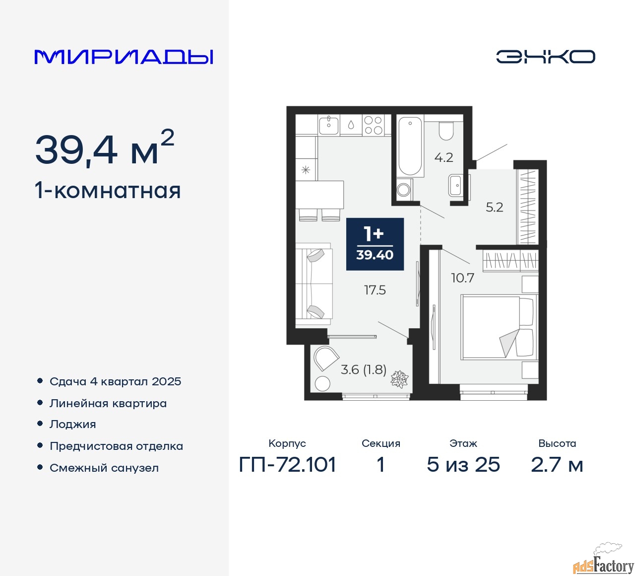 Квартира находится в корпусе ГП-72.101. Дом монолитный, одноподъездный, высотой 25 этажей. На этаже 8 квартир. В подъезде 2 пассажирских и 1 грузовой лифт. Окончание строительства - 4 квартал 2025 года. Оформление сделки по договору долевого участия.