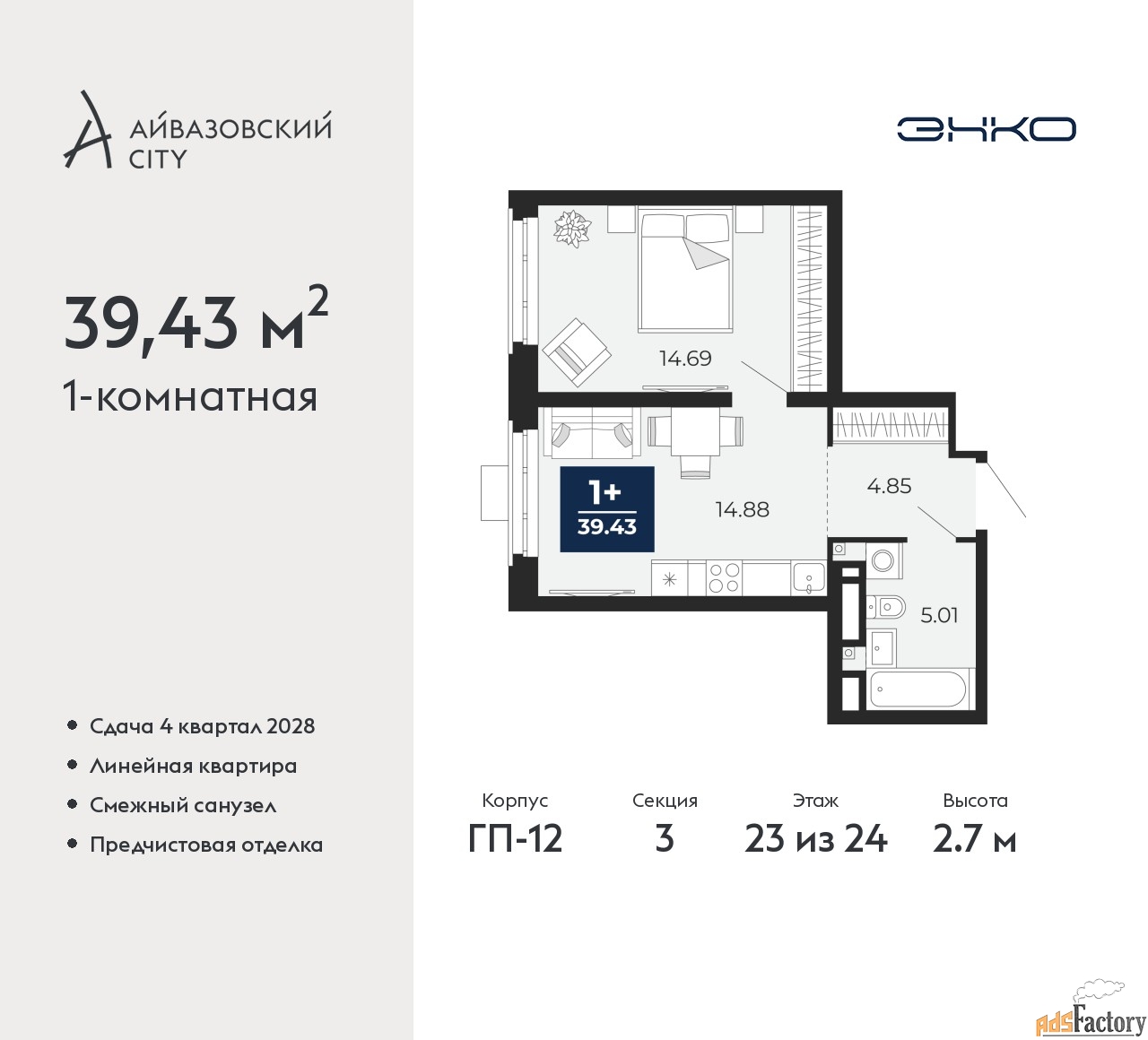 Дом монолитный, многоподъездный, высотой 24 этажа. Квартира находится в 3-й секции в корпусе ГП-12. На этаже 6 квартир. В подъезде 1 пассажирский и 1 грузовой лифт. Окончание строительства - 4 квартал 2028 года. Оформление сделки по договору долевого участия.