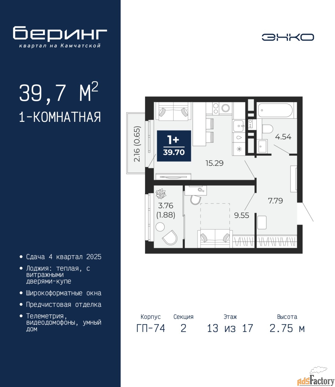 Дом монолитный, многоподъездный, переменной этажности, от 9 до 21 этажей. Квартира находится во 2-й секции высотой 17 этажей в корпусе ГП-74. На этаже 7 квартир. В подъезде 1 пассажирский и 1 грузовой лифт. Окончание строительства - 4 квартал 2025 года. Оформление сделки по договору долевого участия.