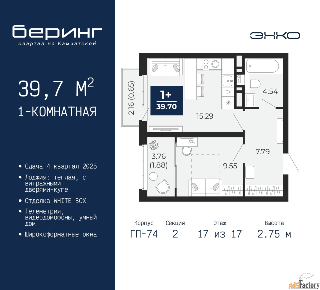 Дом монолитный, многоподъездный, переменной этажности, от 9 до 21 этажей. Квартира находится во 2-й секции высотой 17 этажей в корпусе ГП-74. На этаже 7 квартир. В подъезде 1 пассажирский и 1 грузовой лифт. Окончание строительства - 4 квартал 2025 года. Оформление сделки по договору долевого участия.